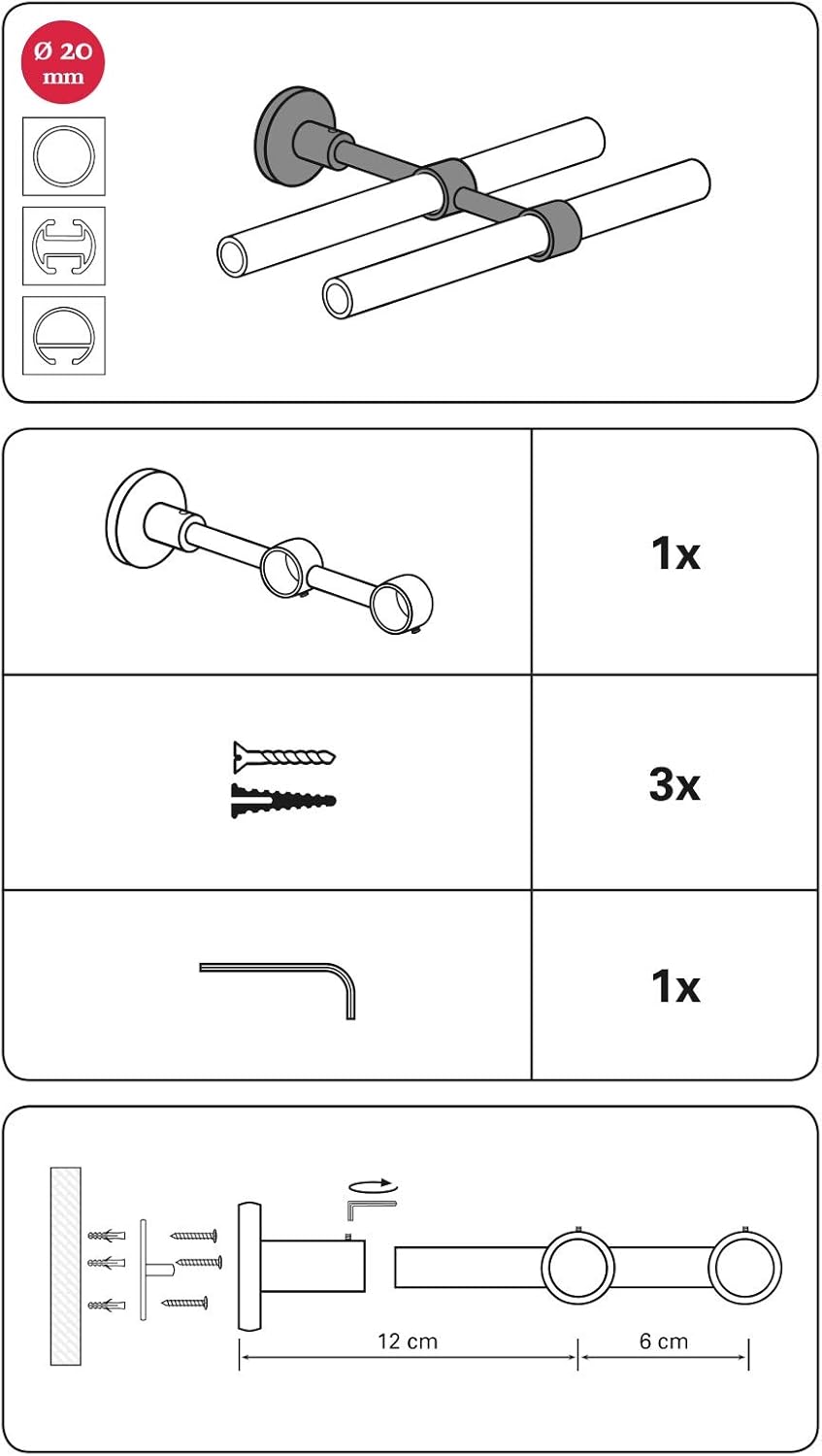 Product Description Gardinia is not only a well-known brand, it is also a strong and reliable company with a clear vision: offering stylish outfits with a perfect fit for any window situation. "Good ideas for windows" has been the credo of the company since its foundation in 1950. What sounds simple and looks nice in the end actually requires the daily, dedicated work of approximately 600 employees around the world. The most important ingredients of our sustainable success are not only courage, innovative drive and a sensitive instinct for modern living spaces, but also love and passion. A love for our product, the humans behind the windows, and our partners, without whom we would never have been able to write such a success story. And a great passion for thinking out of the box – both in terms of technology and marketing concepts – and for those beautiful things that make our lives a little bit happier, day by day Set Contains: bracket Ø 20 mm 12 / 6