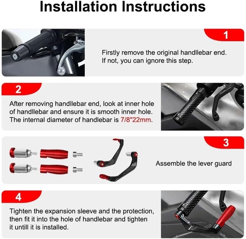 Exquisite embellishment: The motorcycle brake lever protector adds a touch of fashion decoration to your motorcycle, changes the ordinary design, injects unique colors, and enhances its charm.FOR Kawas&aki NIN&JA ZX-10R ZX10R 2001-2023 2024 Motorcycle Handlebar Brake Clutch Lever Hand Guard Protector Handguard Shield--Made of aluminum alloy material, our handle bar guard is durable and not easily deformed or rusted. --There are five colors of black, blue, red, g and silver for you to choose to perfectly match your vehicle. --Replace the brake clutch for motorcycles, providing perfect lever position and good braking performance, improving your riding safety. Now you can rely on a reliable handle protector. --These motorcycle handlebar brake lever protectors are suitable for 7/8" (22 mm) handlebar vehicles, such as motorcycles, motorcycles, scooters, electric vehicles, mountain bikes, etc. --Very durable and beautiful! Safely protect your hands from injury! Name: Motorcycle hand guard Material: aluminum alloy Applicable models: Suitable for vehicles with 7/8" (22 mm) handlebars Process: CNC process Product color: black, blue, red, g, silver (optional)installation steps: 1.First remove the orginal car plugS ,no one can omit this step 2.After removing the plugS ,look at the inner hole of the handlebar and wheter it is a thread or a smooth inner hole (if it is a threaded hole ,plealse contact customer service to replace the expansion soft cover before purchase ) 3.First tighten the expansion sleeve and the protection and tighten it until it is installedAfter-sales guarantee: If you have any questions about the motorcycle horn brake hand guard bow, you can contact us directly, We will provide you with solutions in time.