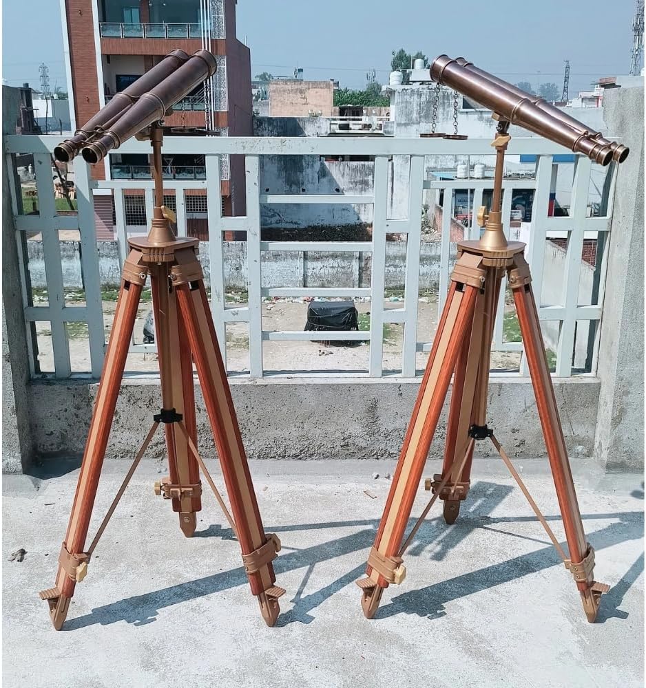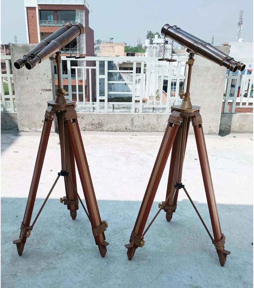 Transform your space with these stunning antique-style brass binoculars mounted on elegant nautical floor tripod stands. This sophisticated set of two decorative telescopes brings maritime charm and vintage appeal to any room. Each piece features a beautifully crafted brass telescope mounted atop a sturdy wooden tripod stand with classic nautical styling. The rich wood tripods offer both stability and adjustability, allowing you to position the binoculars at your desired height and angle. The brass construction of the binoculars adds an authentic nautical feel while providing an eye-catching metallic contrast to the warm wooden stands. Perfect as statement pieces in a study, library, coastal-themed room, or any space where you want to create a sophisticated focal point. These decorative pieces serve as both functional sculptures and conversation starters, ideal for collectors of maritime artifacts or anyone looking to add a touch of nautical nostalgia to their decor. The timeless design and quality craftsmanship ensure these pieces will remain cherished decorative elements for years to come.