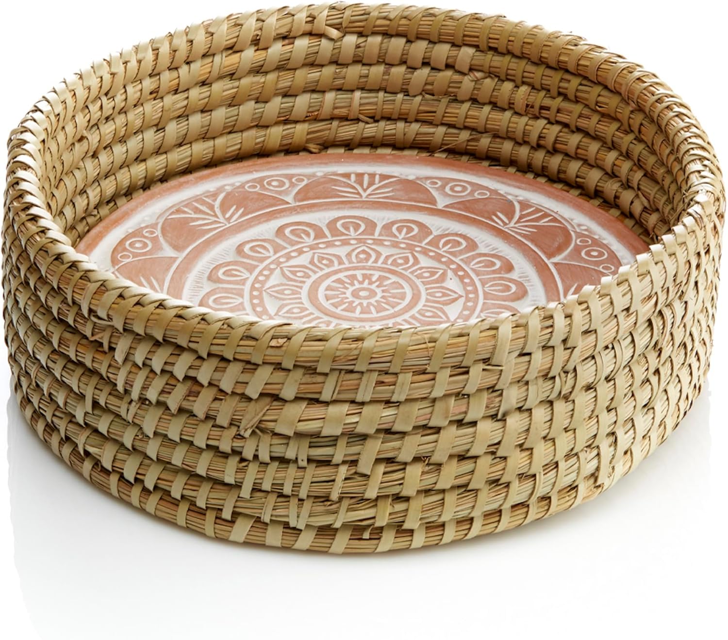 What's better than the smell of warm bread? Nothing! Our bread basket, handwoven from kaisa grass with palm wrap, comes with a terra cotta bread warmer that fits perfectly inside the basket! Basket: Rinse with water. Do not rub stains or spills from your basket. Not dishwasher safe. Use and Care instructions: Rinse before first use. Dry well. Preheat oven to 350°F. Place terracotta stone in oven and bake for 10 minutes. Do not put basket in oven. Handle carefully, place stone in basket. For best results, wrap food in towel and place on warmer. To clean, rinse with water. Not dishwasher safe.