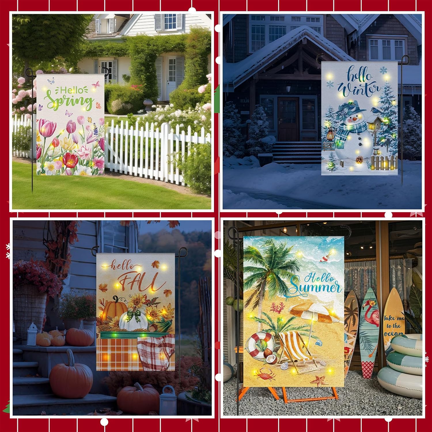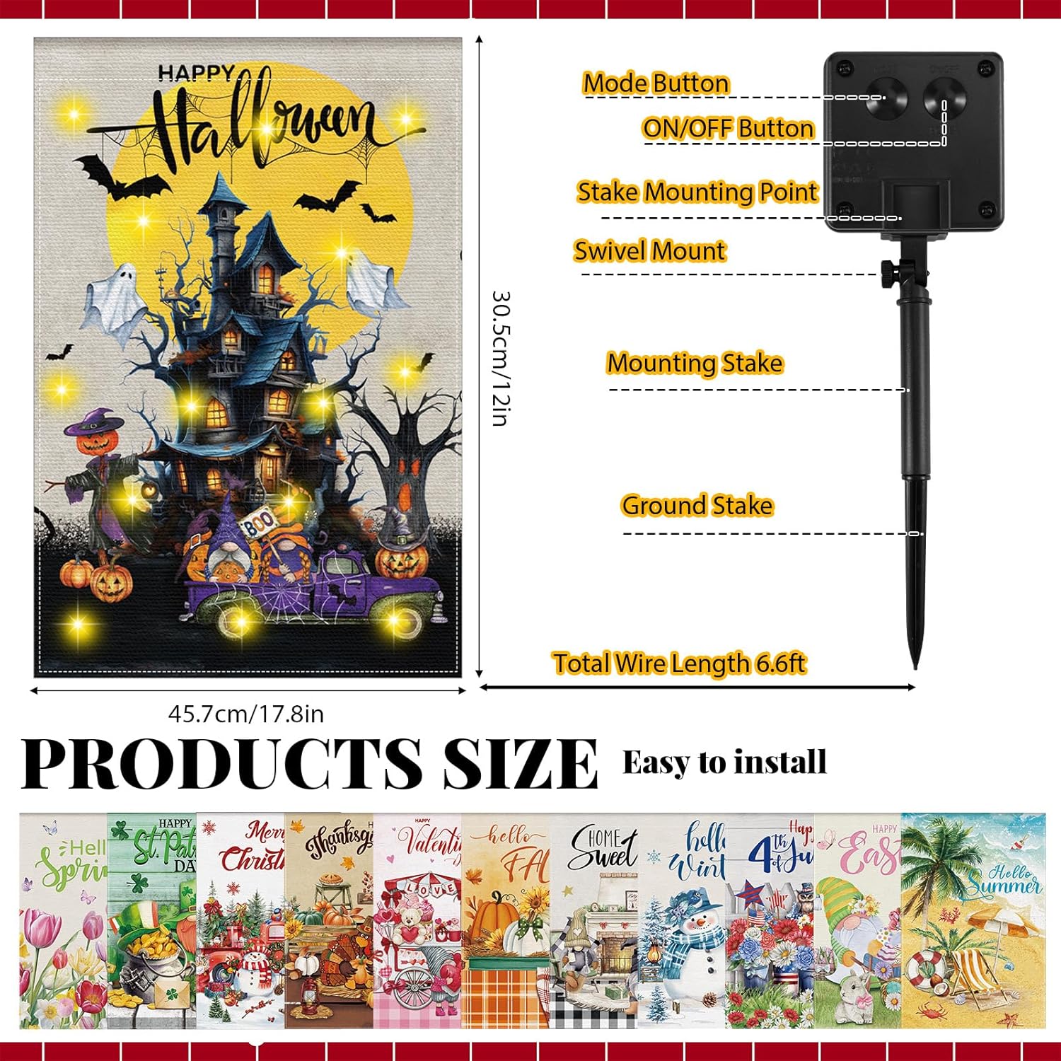 Features: Our holiday flags design with classical seasonal elements, vibrant, colorful and adorable, which will make your house full of holiday atmosphere when placing in yard. Lovely gifts for the all seasons! Great gifts for your family and guests! Dress up your home yard, lawn or garden with these beautiful outdoor garden flags, celebrate with your loved ones, and be the envy of the neighborhood. You can choose from 8 different lighting modes and speeds to enhance the festive ambience, making your holiday colorful. Specifications: Material: linen fabric Color: multicoloured Size: Garden flags: 12 x 18 inches Package includes: 12 X Seasonal LED garden flags Notes: Manual measurement, please allow slight errors on size. The color may exist a slight difference due to different screen displays