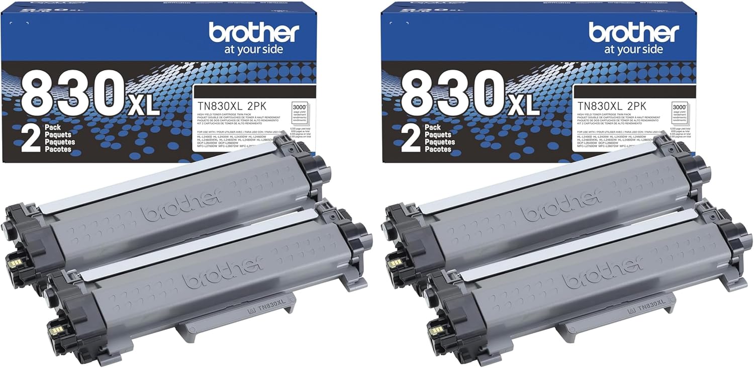 Print confidently and print more with Brother Genuine TN830XL High Yield Black Toner Cartridges, an excellent choice for efficient, high-quality laser printing. Delivering page yields up to 3,000 pages,(1) TN830XL provides a combination of lower print costs per page with the convenience of fewer cartridge changes compared to Standard Yield TN830 cartridges. Expertly engineered, Brother Genuine is the only toner brand recommended for Brother Monochrome (Black & White) Laser Printers. With the reassurance of dependable compatibility, this cartridge produces consistently crisp, precise results making it the reliable choice for producing professional documents and personal paperwork with ease. A must-have for consistently impressive quality, Brother Genuine Toner is the reliable choice for producing professional documents and personal paperwork with ease. When it’s time to replace your printer’s toner cartridge, the Brother Genuine brand provides seamless toner refills. Or try the worry-free ease and flexibility of a Brother Refresh EZ Print Subscription smart ink & toner service to never worry about running out of toner again.(3) For best results, use with Brother multi-function and all-in-one monochrome laser printers: HL-L2400D, HL-L2405W, HL-L2420DW, HL-L2460DW, HL-L2460DWXL, HL-L2465DW, HL-L2467DW, HL-L2480DW, HL-L2865DW, DCP-L2640DW, DCP-L2647DW, MFC-L2760DW, MFC-L2807DW, MFC-L2820DW, MFC-L2820DWXL, MFC-L2900DW, MFC-L2900DWXL, and MFC-L2980DW. Disclaimers 1. Approx. toner cartridge yields in accordance with ISO/IEC 19752 (Letter/A4). 2. Free app download and wireless connection required. Compatibility may vary based on device and operating system. The following printer model is not compatible with Brother Mobile Connect app: HL-L2400D. 3. Visit manufacturer’s website for more information. Images are for illustrative purposes only. Specifications subject to change. 5. Backend