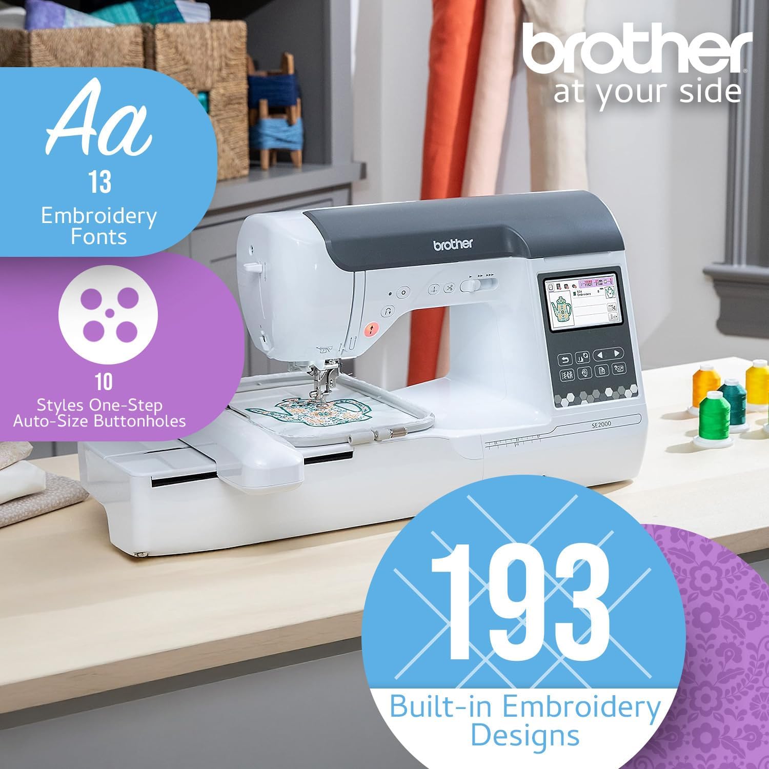 This easy to use and professionally engineered machine allows you to create projects from scratch with 241 built-in sewing stitches and 193 built-in embroidery designs. Download 50 additional free designs from the Artspira App.* A large LCD color touchscreen display allows users to view their designs and editing options in full color prior to beginning their sewing project. The Brother SE2000 also features My Custom Stitch, which permits you to design your own custom sewing stitches and save them on your machine for future use. With the flexibility to combine designs, change colors, and upload multiple pre-designed patterns, the SE2000 combination sewing and embroidery machine has limitless applications. The design editing feature allows you to easily change individual embroidery thread colors using the built-in color palette and preview them on the 3.7” Sew Smart touchscreen. The 5" x 7" embroidery field provides ample space for larger designs and lettering and for combining designs with less rehooping. The total 241 built-in stitches include an impressive array of decorative stitches and 10 styles of 1-step buttonholes that are automatically sized to fit your buttons. The Brother SE2000 sewing and embroidery machine has the combination of wireless LAN and the free downloadable software Design Database Transfer that lets you send embroidery files from your PC to your machine (no USB required). It also includes 13 fonts, and you can choose from the selection of built-in script, outline, serif, and sans serif fonts and combine them with built-in or purchased designs for personalized creations. The SE2000 has Color Sort, which adjusts the order in which multi-color embroidery designs are stitched, thus reducing color changes, and making it more efficient. In addition, the practical Jump Stitch Trimming function automatically trims any excess thread jumps within the color. If you’re searching for an easy to use and diverse combo sewing and embroidering machine, the Brother SE2000 is an exceptional choice. This machine is backed by a 25-year limited warranty along with technical support for the life of the product. Disclaimers: *Machine firmware update (1.51 or above) & Artspira mobile app download are required to redeem designs. A USB drive is required (not included) to update the firmware. For the latest firmware update, please visit www.support.brother.com. The embroidery patterns offered are for personal, non-commercial use only. (1)Compatibility may vary by device and operating system. Requires connection to a wireless network.