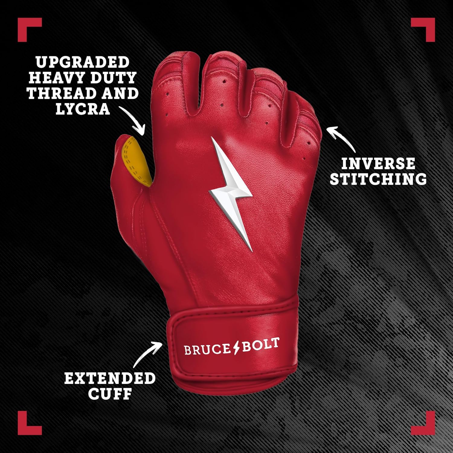 Crafted by artisans, each pair of BRUCE BOLT Red batting gloves boasts premium 0.9mm Cabretta leather, renowned for its unmatched softness, durability, and superior feel. The gloves are meticulously stitched for a buttery-soft touch that outlasts competitors. If they stiffen, simply apply leather conditioner or mink oil to restore their initial softness. Players are amazed by the comfort upon first wear.