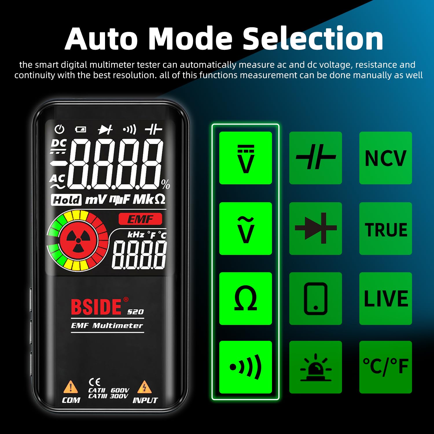 How easy do you think it will be to use a multimeter Designed with beginner in mind - BSIDE smart technology make this multimeter can automatically identify the tested parameters and choose their required range. How large do you think the screen of the multimeter Our multimeter has a super large 3.5inch LCD display, It can show 3 test results on the screen, greatly enhancing the test experience. Specifications: Max Display: 9999 counts Display Type: Color display Screen: 3.5 inch DC Voltage: 0.5V-620V ±(0.8Percent+3); Resolution: 0.001V AC Voltage: 1.0V-620V ±(1.2Percent+5); Resolution: 0.001V Resistance:1O-10.0MO ±(1.2Percent+3); Resolution: 0.1O Capacitance: 0.5uF-1000uF ±(3.5Percent+8), 1000uF-6000uF ±(4.5Percent+10); Resolution: 0.1uF Frequency: 10Hz-1000Hz ±(2.0Percent+10); Resolution: 1Hz Diode: Measure diodes within 1.0V EMF Detect: alarm beep sounds, LCD screen display stripe Live Check: alarm beep sounds, LCD screen display stripe Continuity: If the resistance is less than 30O, the beeper sounds Power: Rechargeable 3.7 V x 1 battery (included) Size: 143x69x17mm Weight: 320g Package Includes: 1 x Multimeter 1 x Test Leads 1 x Carrying Case 1 x Rechargeable Battery 1 x User Manual.