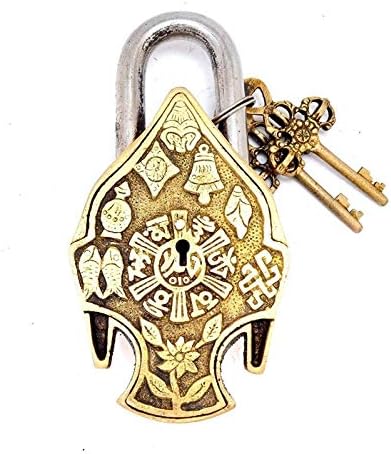 A beautiful door lock of brass is suitable for your home. It will come with two key made by brass.you can use this figure lock anywhere. This pad lock have a antique look . Its look excellent in your home or office. Best for gift. You can use this figure in decorative purpose also.This lock looks fabulous and is solidly constructed ,This beautiful reproduction of an ancient Tibet Padlock is 6 inch high and 2.75 inch wide and weighs 520 Grams. The Lock is sturdy and functional and comes with a set of 2 keys The Lock and Unlock hole of the Padlock is in backside of this lock . This is fully functional and very very strong Lock for use .