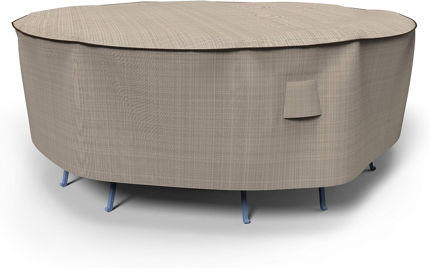 Our Round Patio Table and Chairs Combo Cover, Large provides stylish, durable protection for your outdoor patio furniture. Tastefully designed to match your patio set, this collection comes in an elegant black-and-ivory tweed pattern with dark gray piping and is contoured to fully cover your patio furniture. The StormBlock Mojave collection combines the long-lasting durability of our machine-woven 600 denier polyester with groundbreaking StormBlock technology and UV protection. With StormBlock technology, water rolls right off this cover, taking mud, tree-sap, dirt and bird droppings with it. Meanwhile, our strap and buckle system makes it easy to fasten your cover to the legs of your patio furniture for added security in windy weather conditions and sewn-in air vents create effective air flow. Cover Measures: 100" Dia. x 30" Drop.