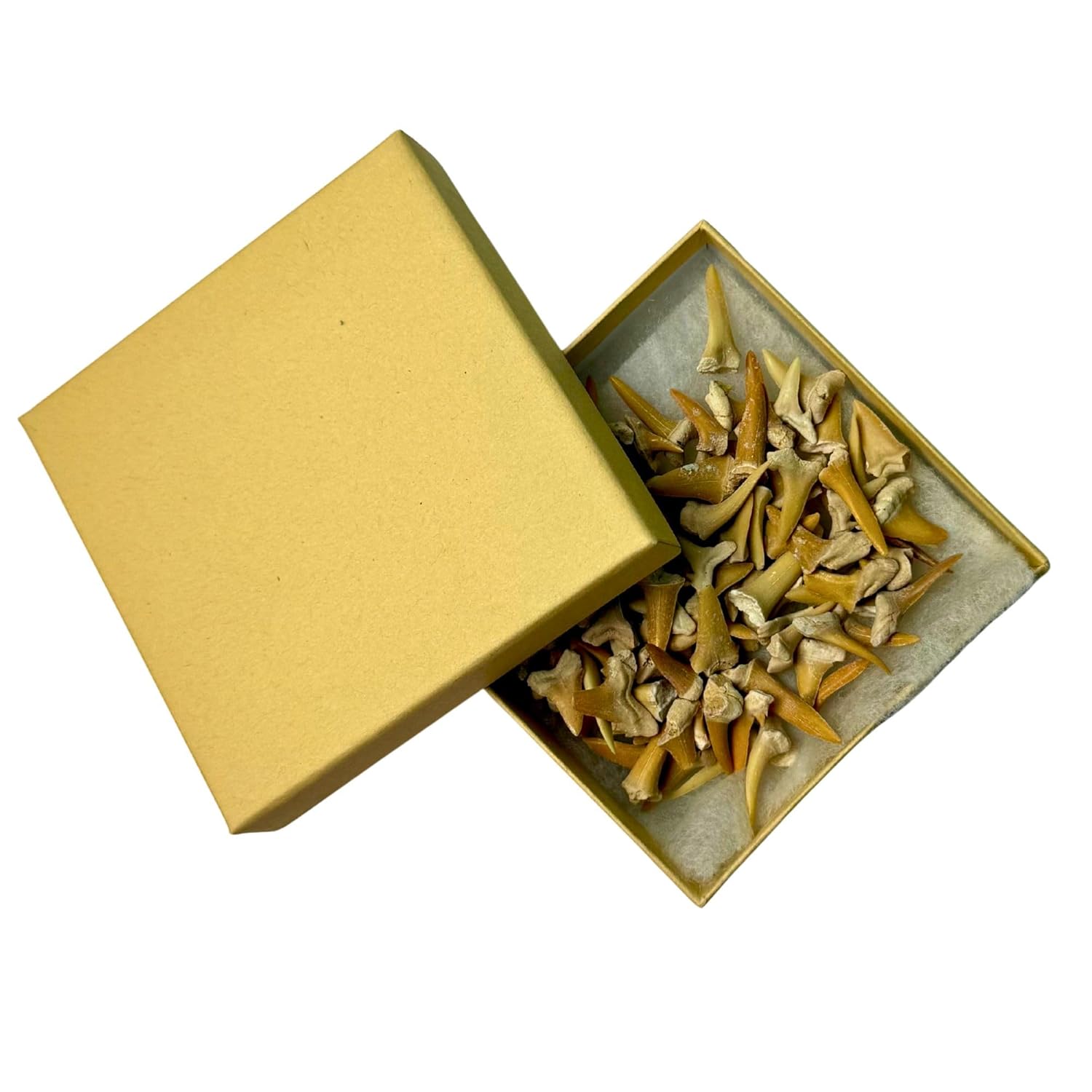 Immerse yourself in the wonders of prehistoric marine life with this bulk lot of 100 real shark teeth fossils. Carefully collected and preserved, these fossilized remains offer a tangible connection to the ancient creatures that once roamed the oceans. Each tooth is a unique testament to the incredible diversity and resilience of nature. Packaged in a 3.5x3.5x1 inch gift box, this collection is perfect for educational purposes, display, or as a captivating addition to any fossil enthusiast's collection. Explore the mysteries of the deep and let these remarkable artifacts transport you back in time. Please note that due to their natural origin, the size and appearance of individual teeth may vary. Out of the 100 the box includes at least 20-25 full teeth, others may be broken or pieces.