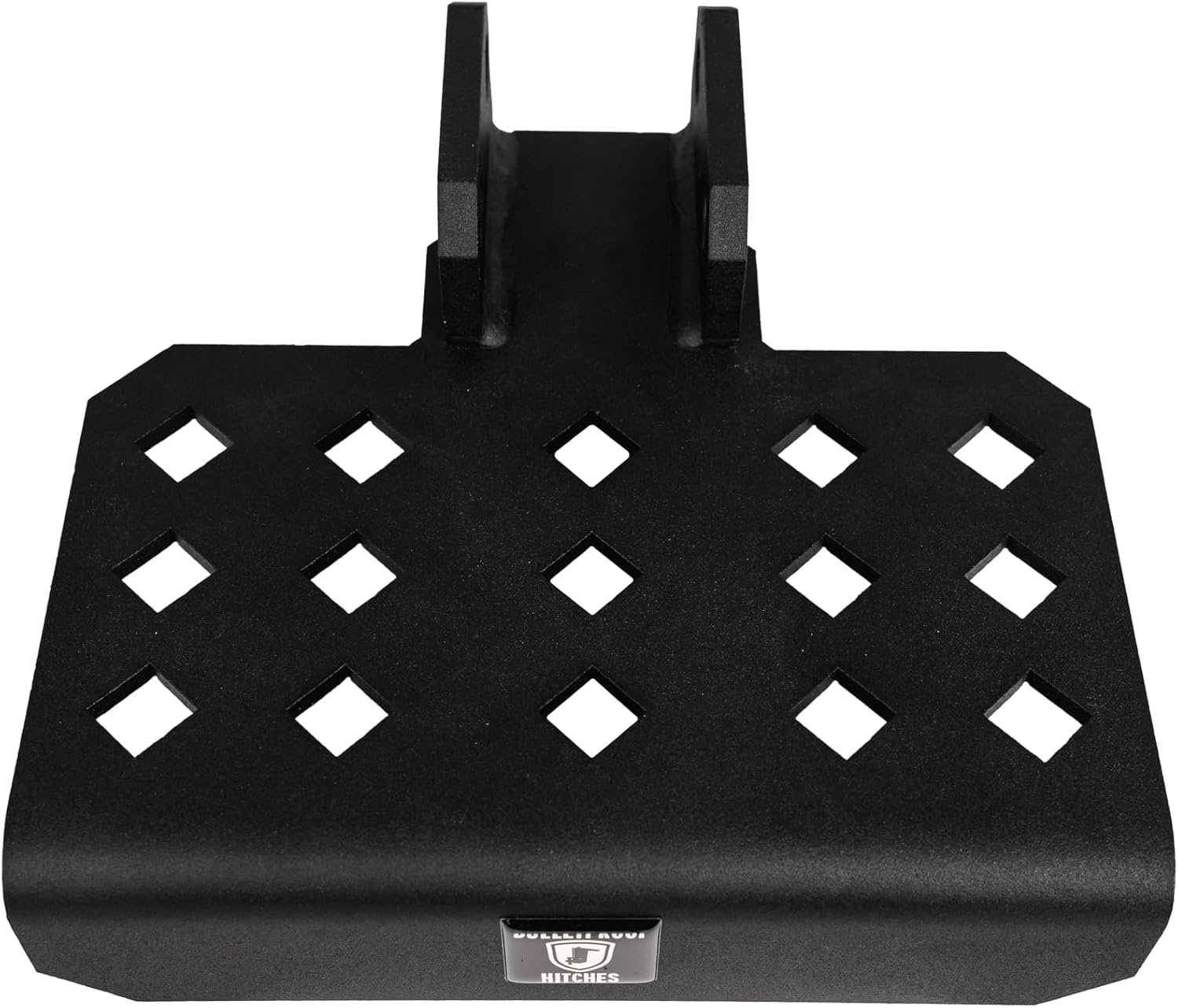 The BulletProof Hitch Folding Step Attachment is the perfect accessory for any steel Medium, Heavy or Extreme Duty BulletProof Hitch. It makes getting into the bed of your truck or reaching the roof of your SUV or trailer safer and easier. The folding step attachment allows the step to be folded vertically out of the way when not in use. Made from heavy-duty 1/4" steel that is press-braked to a nice edge and rated for up to 1,000 pounds. This attachment occupies two pin holes in the channel of the hitch, which will allow it to be used while the dual ball is in the channel. It features the same black textured powder coat of all BulletProof Hitches. Features & Benefits: Works with any steel Medium, Heavy, or Extreme Duty BulletProof Hitch Rated up to 1,000 pounds Comes with 2 corrosion-resistant pins and R-clips to secure the attachment into the channel of the hitch