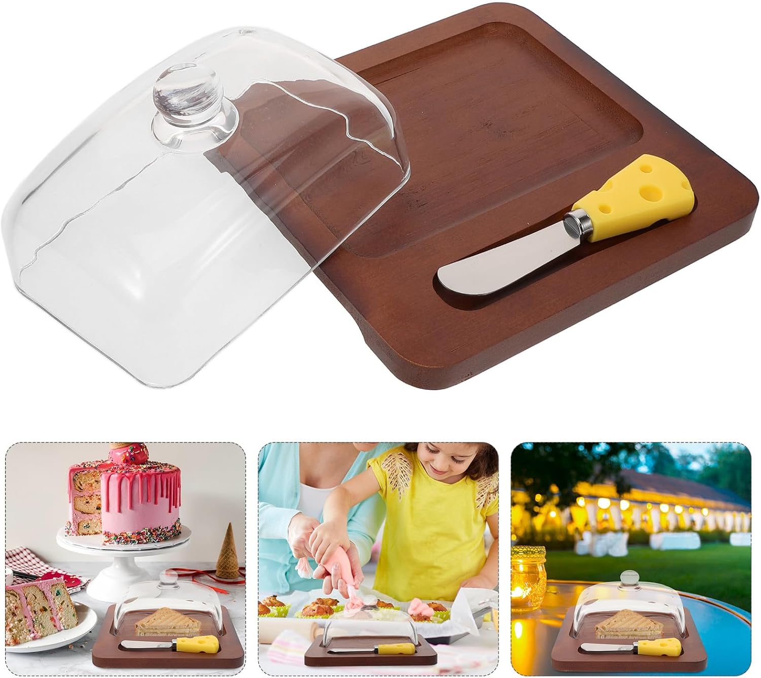 Package Include 1 x butter tray 1 x dome 1 x cutter Characteristics - Color: Multi - Size: 19.50X19.00X8.50cm/7.66X7.47X3.34in 13.00X3.00X1.00cm/5.11X1.18X0.39in -Material:Wood, glass, stainless steel -Product Info:Butter box - The sealed lid keeps butter fresh in the refrigerator without mixing other foods’ taste butter holder with lid. - Suitable for restaurant, dessert shop, kitchen, use it yourself, or present it to your friends as a butter container. - The Butter Box is large enough to fit various shapes of butter sticks. A great tool for slicing and storing butter butter storage dish. - Our Butter Box used for cutting butter storage, and can also be stored in the refrigerator for easily cooking and dining wood butter dish. - Big enough to slice butter, easy to use and wash with elegant design bring you a good mood and enjoy delicious food butter dishes.Goods Descriptionbutter counter holder This item a Butter Box with Cutter which is manufactured with good material, classic and delicate.butter dish for countertop With decor, add luxury and chic atmosphere.butter tray Great for home kitchen or freezer using.butter keeper dish Safe to use, stylish and creative