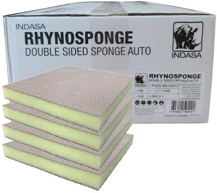 Buy Indasa Rhyno Sponge Beige Micro Fine Grit Double-Sided Hand Sanding Pads, Case of 100 (595169) The INDASA Rhyno Sponge BEIGE MICRO FINE Grit Double-Sided Hand Sanding Pads (595169) are designed to produce a conformable surface, ideal for sanding edges and curved surfaces. These pads are versatile and suitable for various applications, including gel-coat, composite materials, filler, paint, primers, and varnish. Easily identifiable by their Beige color, these Microfine grit pads offer a sanding range of 1000 to 1,500 grit. They can be used wet or dry, with pressure-equalizing foam that helps prevent over-sanding and ensures an even finish on contours and edges. The pads feature optimized aluminum oxide grain distribution and flexible resin, which reduce clogging, minimize grit shedding, and extend their working life for multiple uses.