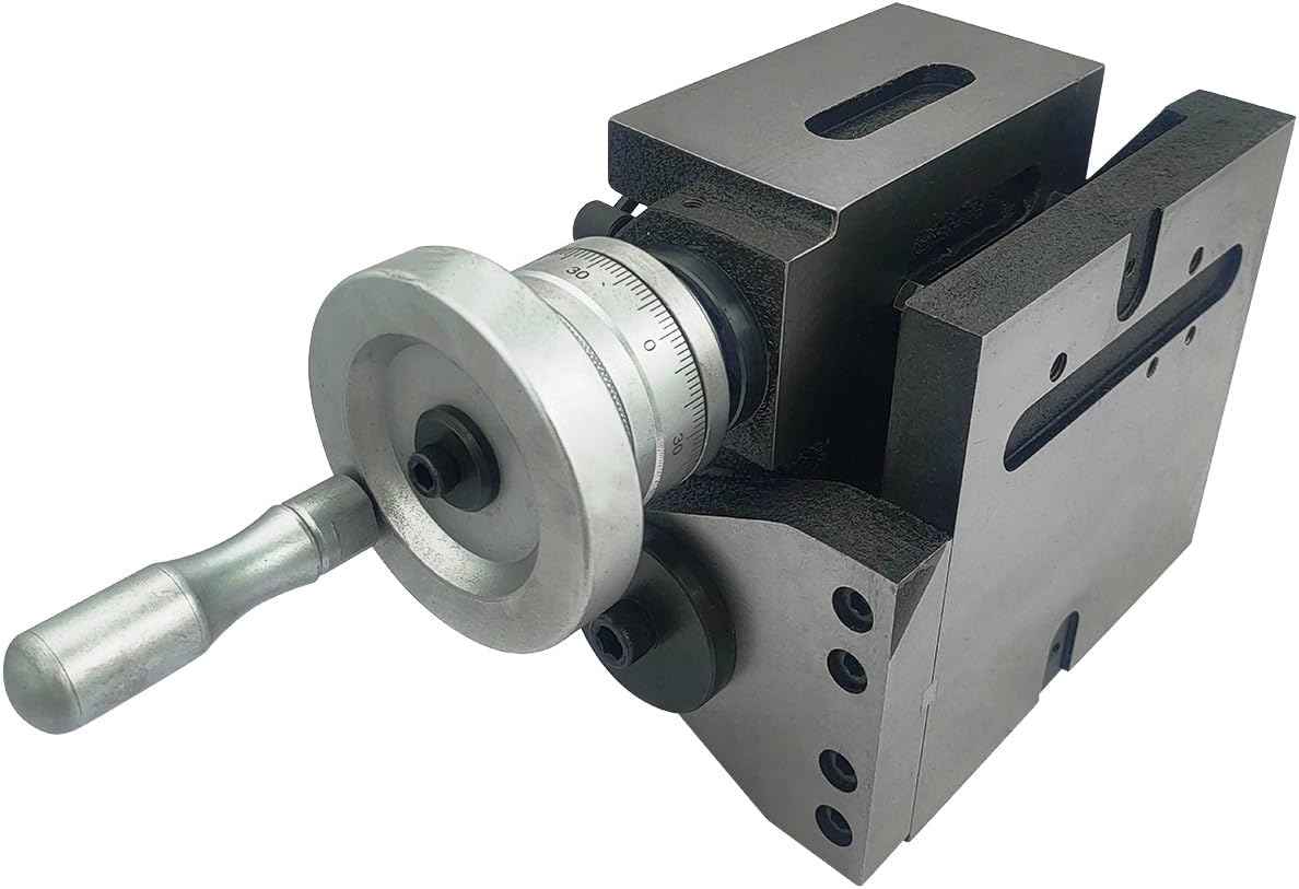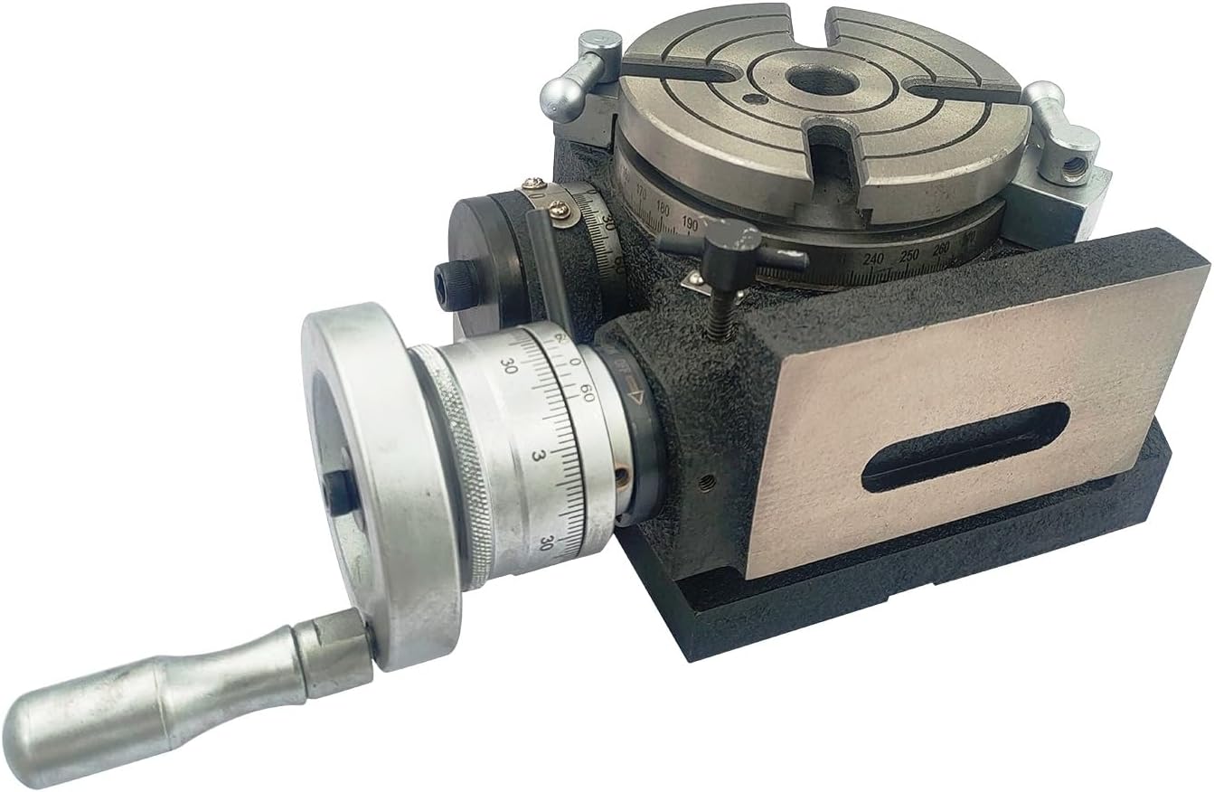 Rigid & Precision made, cast iron HV4- 4 Slots has tilting feature and can also be mounted horizontal & vertically. Diameter of the rotary table is 110 mm. Tilt calibrated 0-90°. Positive stops to locate horizontal / vertical positions. Dis-engageable handwheel for free table rotation. Lubrication points to worm and table rotation. Alloy steel worm. Cast iron gear. Micro collar graduated in steps of 1 min. Worm gear ratio : 1:90, One rotation of the hand-wheel rotates the table 4 degrees Specification: Table diameter : 110 mm II 4" Inch base diameter : 175 x 45 mm , Tee slot width : 11 mm Height ( horizontal) : 120mm, center height in vertical position : 80mm center bore : 2MT