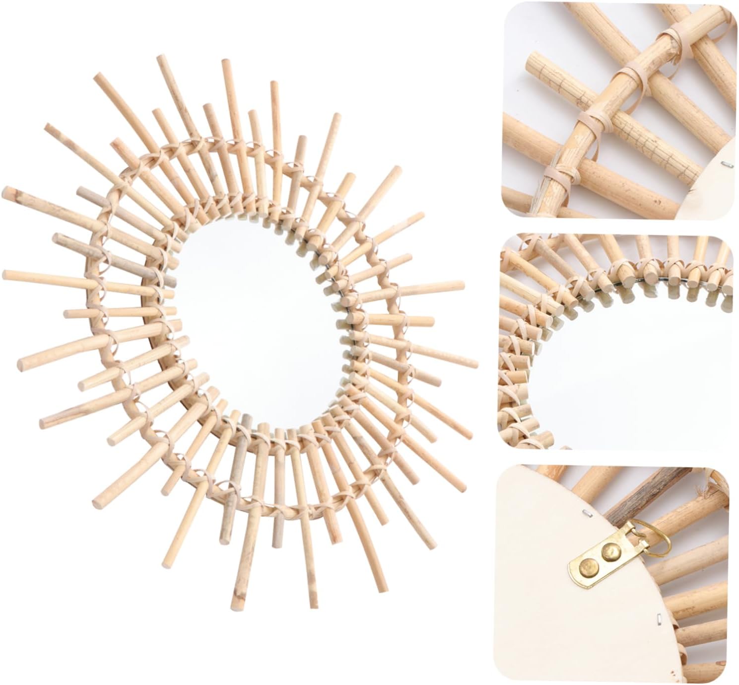 DescriptionSunburst Hanging Wall Mirror Rattan Mirror Decorative Plaque Mirror Antique Makeup Mirror Boho Wall Decoration Mirror Wall Art for Living Room Bedroom Nursery DormFeatures- Color: Khaki.- Material: Glass+Wood.Package Including1 x Hanging Make-up Mirror
