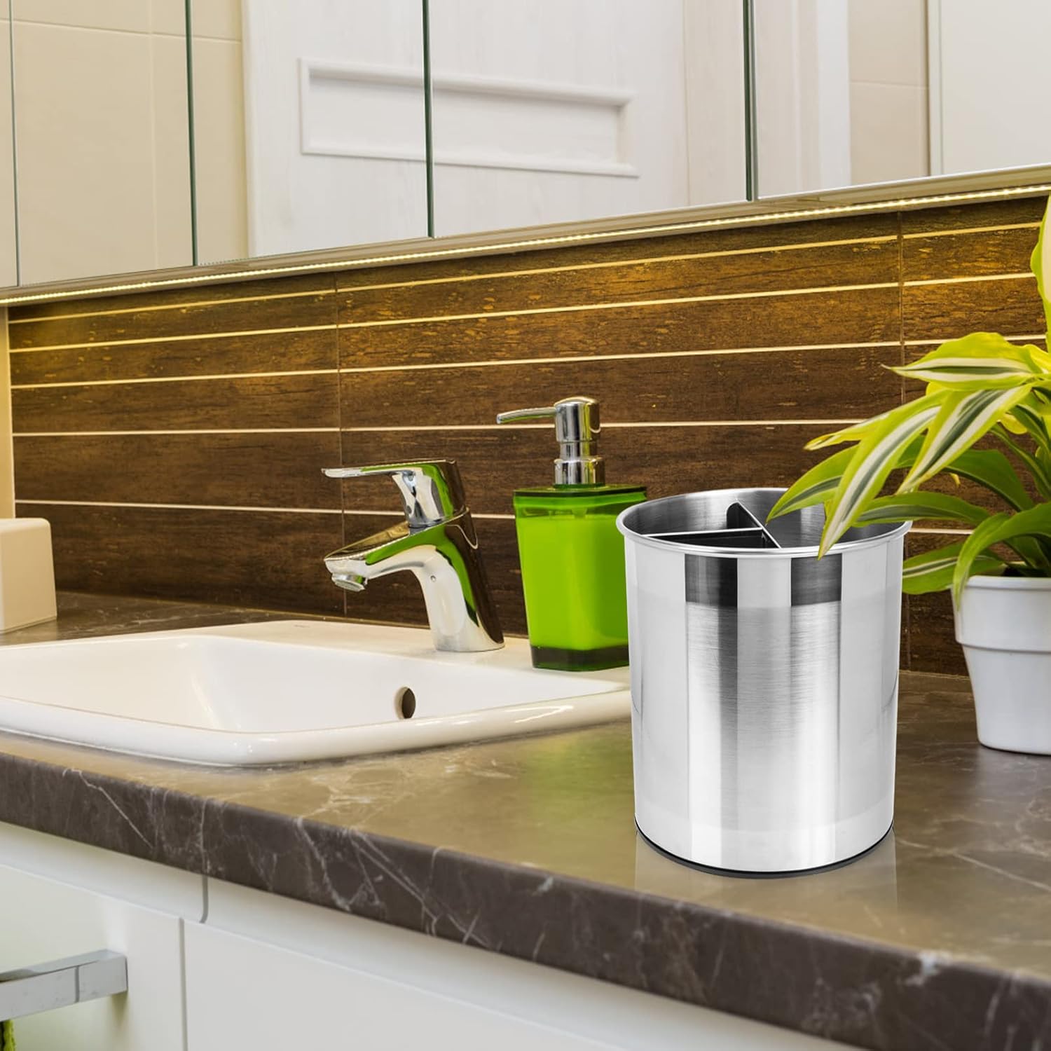 Description This is a portable desktop utensil storage basket, which is a very practical storage tool with craftsmanship, elegant and durable, beautiful and practical, and can be used to store daily desktop sundries, kitchen utensil and other items. Features- Color: Silver,- Material: Stainless Steel,- Size: About 19.50X 17.50X17.50cm/ 7.66X 6.88X6.88inch,- Capacity: 4L,- Made of smooth and durable stainless steel with a fine texture, you can safely use it to store debris.- Versatile as both a practical storage container and a comfortable and gentle decoration.- Reasonable structure, easy to store various small objects, good finishing effect.- It can effectively help you store desktop stationery, remote controller, etc.- crafted with craftsmanship and has an excellent texture, making it a beautiful, durable and practical storage basket. Package Including 1x bucket
