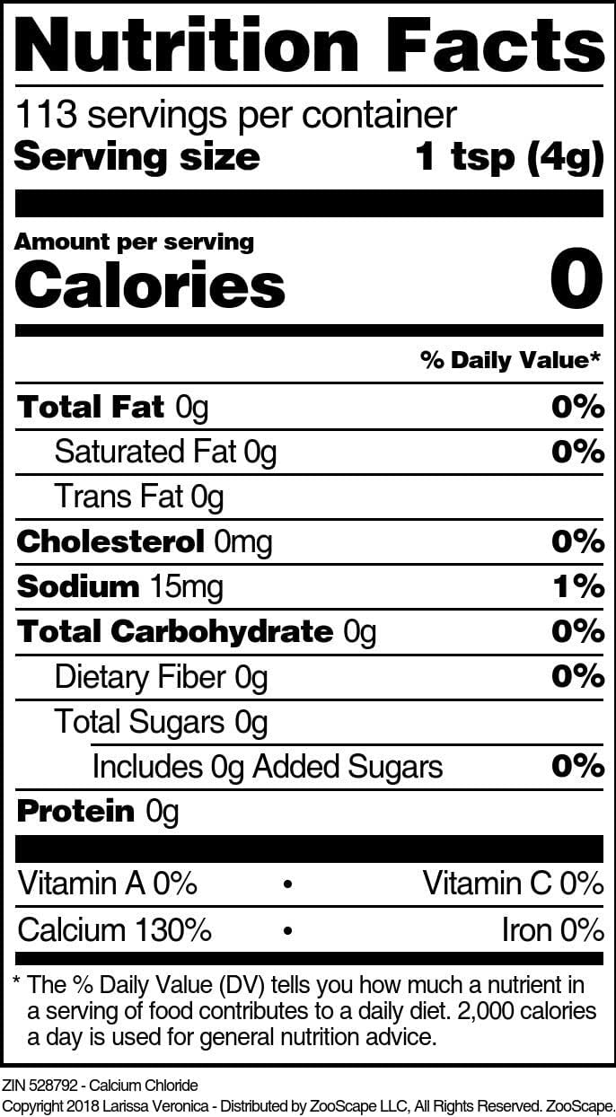Our food-grade Calcium Chloride granules are a Calcium compound used during the pickling process to help retain pickle crisp firmness, resulting in crunchy and crispy dill pickles and other pickled items. Calcium Chloride is generally preferred to Alum powder. - This Anhydrous (Dry) Calcium Chloride (CaCl2) USP (Food Grade) is NOT for as is consumption. - Creates heat when dissolved. Dissolve in cool liquid below 80 degrees F. Do not add water to calcium chloride. Add calcium chloride to the liquid. - 1 level teaspoon added to 1 quart of liquid makes a 1/2 percent solution. - Larissa Veronica is an exclusive line of natural premium-quality products that use only the purest and finest ingredients from around the world. Larissa Veronica is hallmarked by the highest possible standards of purity, stability and freshness. All of our products are prepared with the highest elements of quality control, from raw materials through the entire manufacturing process, up to and including the moment that the bottles or bags are sealed for freshness and shipped out to you. Our highest possible standards are certified by independent laboratories and backed by our personal guarantee. - Larissa Veronica strives to make all products affordable and we are constantly researching the market to maintain our affordability and to look for new ways to serve you and the ones you love. Larissa Veronica has become a trusted household name for many families. - Larissa Veronica is packed in tamper-proof, food-grade, recyclable containers. - ZooScape is proud to be the exclusive distributor of all Larissa Veronica spices, snacks, foods and ingredients in the United States, Canada and around the world. - Store Dry at 55-65 F. Vegan. Kosher for Passover. Product of Mexico.