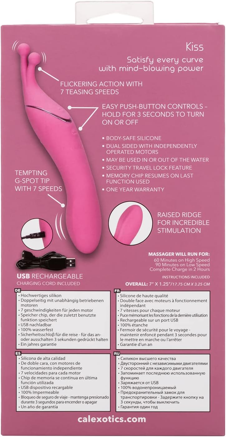 The Tempt & Tease Kiss by CalExotics is a versatile, dual-ended vibrator designed to satisfy multiple desires simultaneously. One end features a flickering clitoral stimulator with a soft, beaded tip for targeted external teasing, while the other offers a curved G-spot stimulator for deep, rumbly internal pleasure. With two independent motors, this toy allows you to customize your experience by mixing and matching functions at both ends.