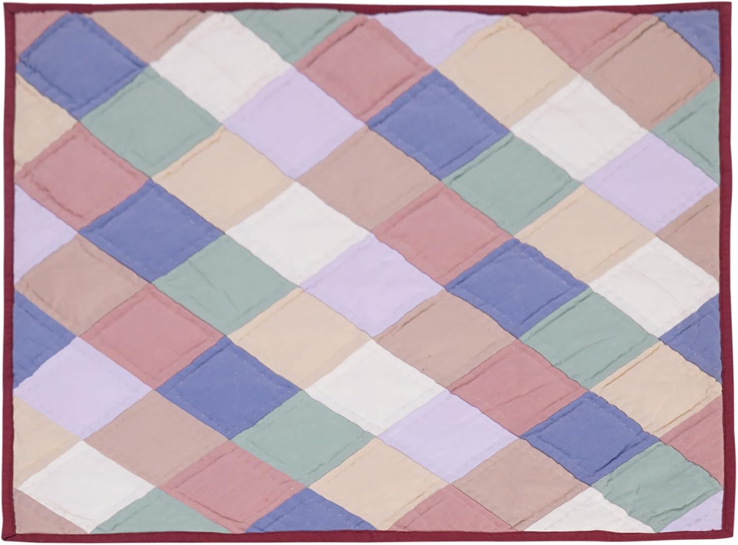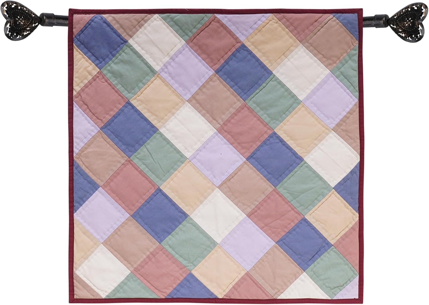 Wall Hanging Quilt is 19"x19" represents patchwork quilt design on a small scale and has two sewn pockets in the back for easy hanging. This quilt can also be displayed on a center of a table, end tables or chairs. It can make any corner of the house warm and noticeable. Made of multicolor cotton fabric and has two sewn pockets in the back for easy hanging.
