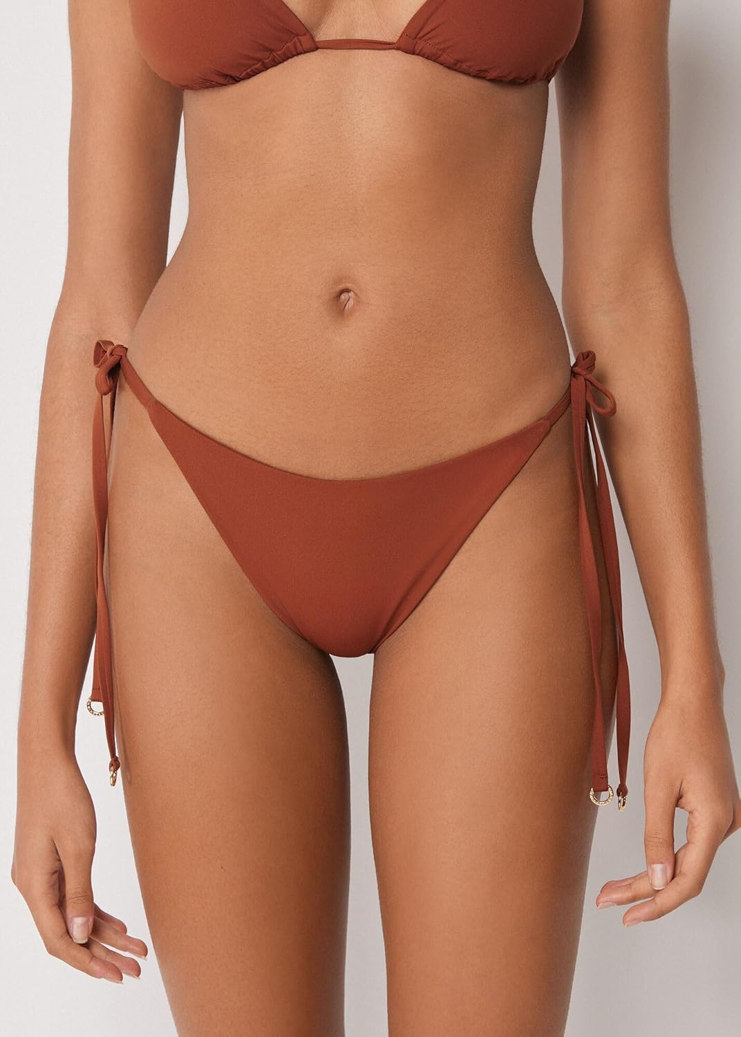 Brazilian bikini bottom with adjustable side ties for a perfect fit. The extremely soft fabric makes it pleasant to wear, offering a light and comfortable feel on the skin. The slightly rounded waist at the front allows for wear with classic coverage or a higher leg, depending on your body shape.