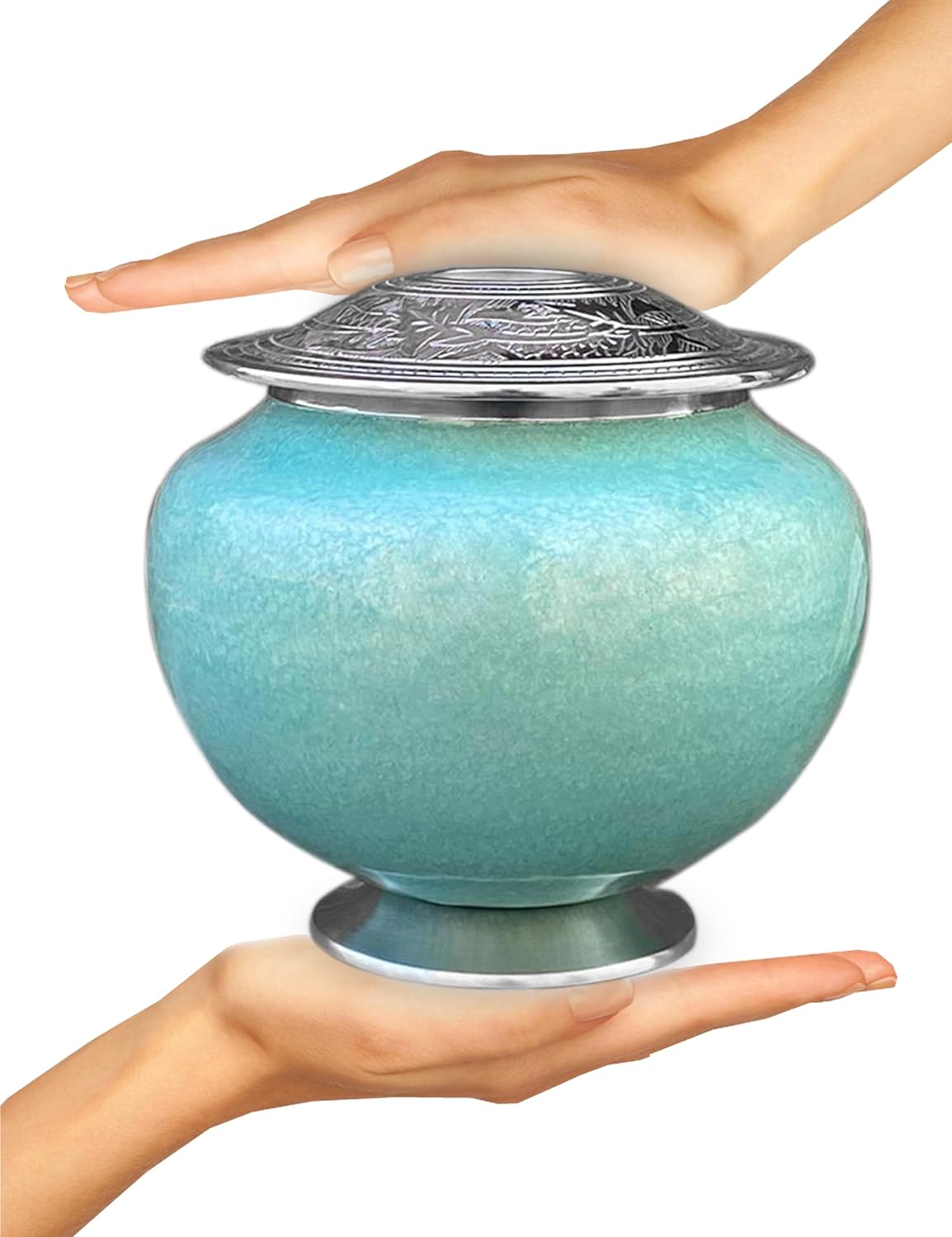 As Unique as the Lives they Symbolize Our Cremation Urns are designed to not only provide a final resting place for your loved one forever, but serve as a beautiful work of art within your home, niche, or columbarium. Bold & Divine Cremation Urns for adult ashes is a soft and heavenly tribute for your loved one. All of our cremation urns are handmade to perfection by an ancient process called sand casting. Handcrafting provides each urn with its own unique variation in color, finish and texture -- so no two urns are exactly alike. Truly, a one-of-a-kind urn to cherish your loved one. The urn has a threaded screw-top lid for easy handling and secure display. It is ideal for home, columbarium, scattering, or burial. This cremation urn is made of solid Aluminum and is constructed to last without tarnishing. Comes with a velvet gift bag/box. FEATURES: ⟐ Hand made with extreme detail. ⟐ Threaded lid. ⟐ Each cremation urn includes a velvet gift bag or box. ⟐ Felt bottom to protect your furnishings from scratches.