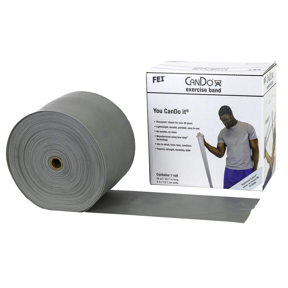 Product Description The CanDo Low Powder Exercise Band, 50 yard roll, Green: Medium is conveniently packaged in a dispenser box. Simply unroll the desired length of exercise band from the box and cut with scissors to customize your resistance training workout. CanDo low powder exercise bands are made of natural rubber latex, which may cause allergic reactions. For those with latex sensitivities, there are latex-free alternative offerings of CanDo exercise bands. Each CanDo band is 5" wide and can be used with any band or tubing accessory to customize your workout. TheraBand colors licensed by Goldberg from Hygenic Corp without endorsement. Manufacturer Contact Information 800-431-2830