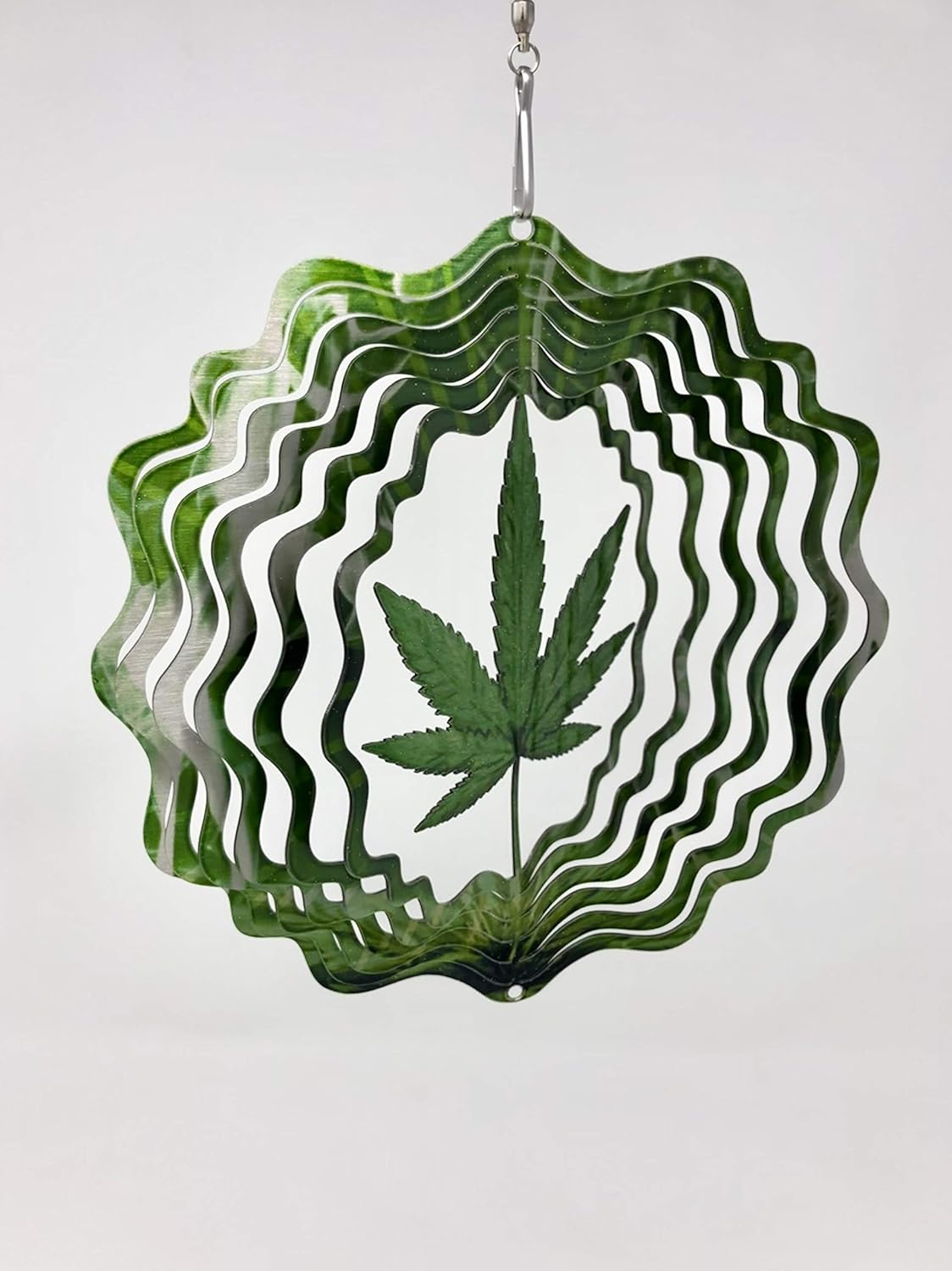 These marijuana leaf garden decorations are the perfect gift for your friends or family. The 3D stainless steel wind spinner comes in a box set with a crystal spinner that hangs from the bottom. You can press open for the 3D effect to spin. This also helps catch the wind and helps it spin. Each spinner is a unique design printing and no two are alike. Press open your spinner, hang in your desired location and watch the sun dance off the surface as it spins. The 6 inch spinner is a SET that includes the crystal tail spinner.