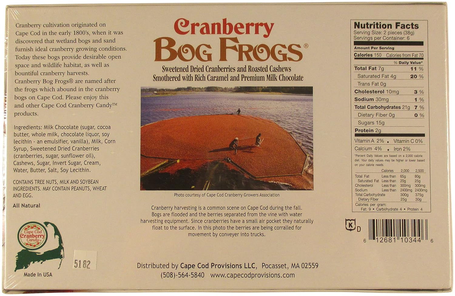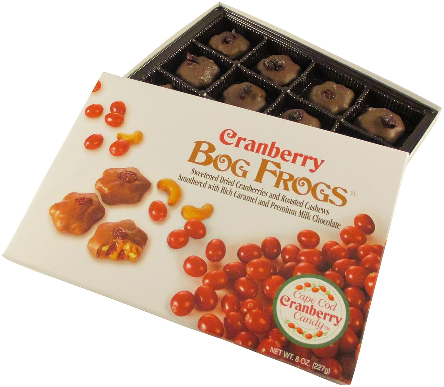 Like a chocolate turtle with cranberries Cape Cod Cranberry Candy Bog Frogs are a scrumptious combination of sweetened dried cranberries, roasted cashews and creamy caramel, enrobed in milk chocolate and individually garnished with a dried cranberry. If you enjoy chocolate cashew clusters, chocolate turtles or chocolate caramel candy, you're sure to love these cranberry Bog Frogs. Straight from the cranberry bogs of Cape Cod Massachusetts, Cranberry Bog Frogs are proudly made in the USA and help support local New England economy. Unique, fun and delicious, these chocolate cranberries are all natural and Kosher approved. They're hopping good. Additional Information 8oz Chocolate box, pack of 3 Each box contains 12 chocolate cashew clusters with cranberries Each box of chocolates is sealed for freshness Cranberry bog frogs make a great present for chocolate lovers anywhere Perfect for birthdays, teacher's presents and more