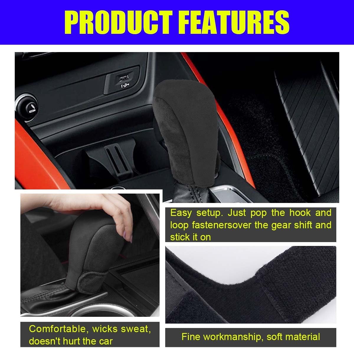 This car gear stick cover is made of high-quality material suede, tough and wear-resistant, comfortable hand feeling, beautiful and upscale, which can provide protection for the gear shift knob and decorate the car interior.Specification:Brand: LHDOSName: Car Gear Shift Knob CoverColor: Black/Orange/Brown/Red/GreenMaterial: SuedeSize: 4.33 × 2.36 inchApplicable: Most vehiclesFeatures:-This car gear shift knob cover is beautiful and practical, perfect for presenting to friends and family or new drivers.-This car gear stick cover reduces slippage caused by sweaty hands, thus enhancing driving comfort and safety.-This car shift knob cover protects your shift knob from scratches and bumps, allowing you to enjoy a pleasant driving experience.