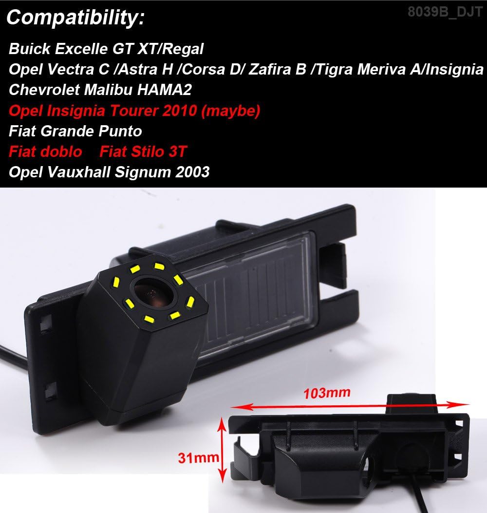 Compatible with all models below: Opel Astra H 2004-2009 Opel Corsa D 2006-2010 Opel Zafira B 2005-2011 Vectra C 1995-2002 Opel Insignia/Haydo/M1/MPE/Fiat Grande Punto Lovns Coupe/Buick Hideo/Regai 2009. Opel Tigra Meriva A Chevrolet Epical/LOVA/Captiva/Cruze/Aveo. Opel Vauxhall Signum 2003 Product parameters: 1. TV system: NTSC (if you want PAL, please email us). 2. Resolution: 480/520 TV Lines 3. Lens Angle:140-170 Degrees. 4. S/N Ratio: above 48dB (AGC-OFF) 5. Video color: night vision color (night version) 6. Video output: 1.0 Vp-p, 75 Ω. 7. Camera:1/3" Color 8. Detection area: 5.8 x 4.2mm 9. Synchronize. System: internal 10. Voltage:DC12V+-1 11. White balance: automatic 12. Tightness: IP67. 13. Effective Pixels: 628 x 586. 14. Electronic Shutter:1/60-1/10,000 seconds Power consumption: ≤ 150mA Power consumption: max 90mA 17. Temperature: -40 °C to +60 °C, RH 95 % max. 18. Minimal illumination: 0.3lux/F1.2. Operating Temperature: -30°C to +50°C, RH 95% 20. 1/3" Sharp Color LCD, 1/4" CMOS LCD Display. Installation Chart: Our package contains a light diagram for children. What you get: 1 x rear view camera. 1 x power cable. 1 x 6 m video cable 1 x user manual (English language not guaranteed).