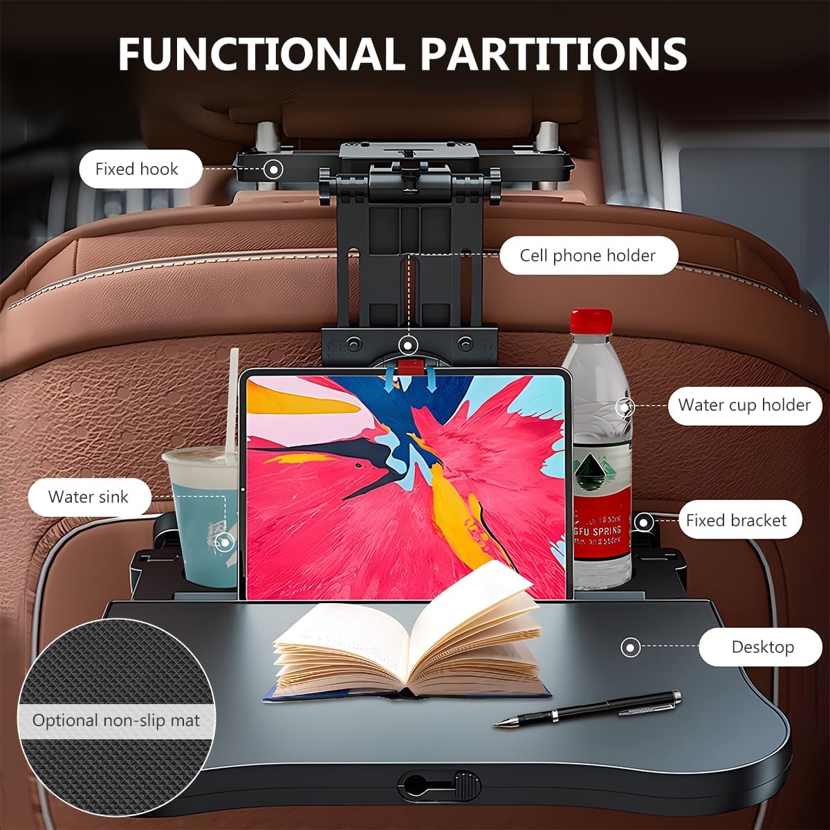Specification:Material: ABSQuantity: 1 PCSColor: BlackWeight: 4.1 lbTabletop Size: 15.2×9.6 inchesAdjustable Height: 8.3 to 11.0 inchesAdjustable Fixator Width: 3.5 to 8.7 inchesFeature: Practical, Foldable, AdjustableFit Type: Universal FitMore information about the car seat tray table:-It comes with an anti-slip pad, which can effectively prevent items from sliding.-It can be folded and stored, does not take up space, and does not block getting on and off the vehicle.-Its bottom has two adjustable-angle support ends that fit the seat better and provide stronger support.