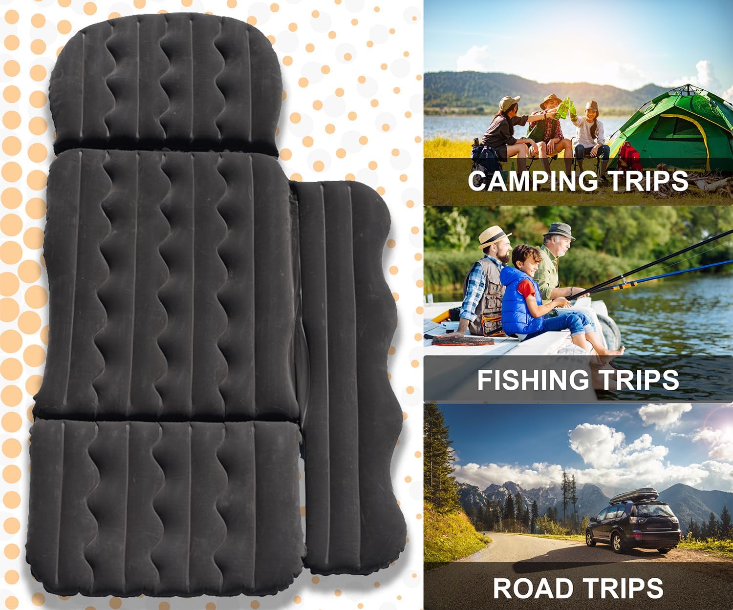 The Car SUV Twin Air Mattress is an inflatable sleeping pad designed for camping, travel, and sleeping in vehicles. Measuring 69" long, 38" wide, and 4" thick, it fits perfectly in the back seat of SUVs, trucks, or cars. The mattress comes with a small air pump, two pillows, and a gap filler to ensure a comfortable and stable sleeping surface. Its twin size provides ample space for rest, making it an ideal travel bed for outdoor enthusiasts and travelers seeking convenience and comfort on the go.