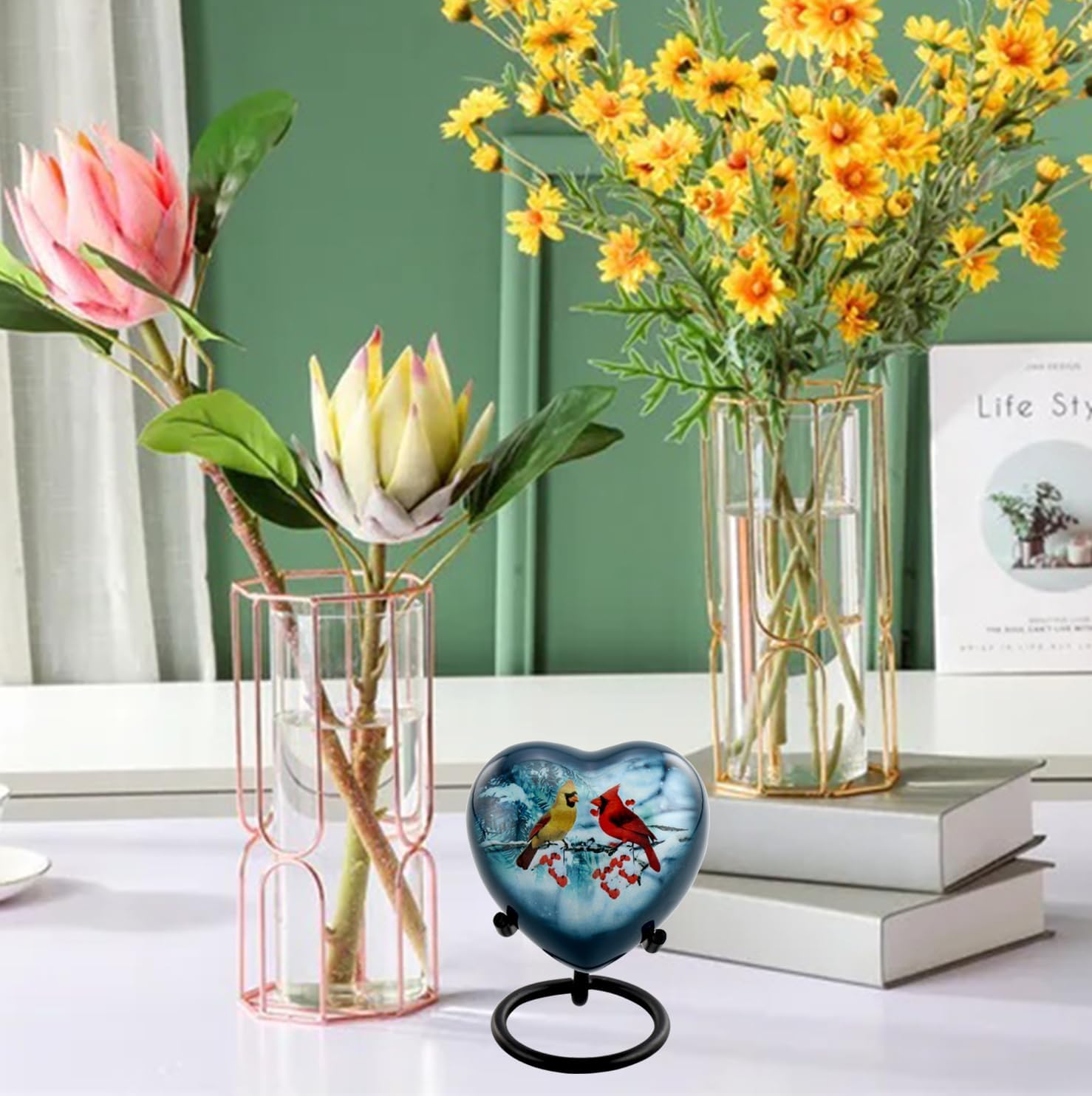Affordable Alloy Hand painted Cardinal Couple Heart Keepsake Urn for Ashes. A Heart Keepsake Urn is perfect for keeping a small momento of your loved one - such as soil or sand from a special location, a lock of hair, dried flower petals, a special note or a portion of cremation ashes. This Heart keepsake fits nicely into the palm of your hand. This keepsake fits nicely into the palm of your hand. A threaded coin slot opening on the base of the urn.