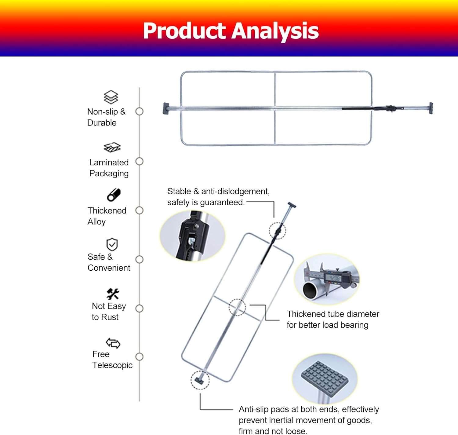 Are you tired of your goods swaying and falling during transportation?Then try our adjustable cargo bar, the perfect solution for securing your cargo during transportation, ensuring a firm hold and preventing unwanted movement. It is suitable for family cars, SUVs, small trucks, pickups and more.Specification:Material: SteelLoad Capacity: 400kg/881.8lbsSuitable for use in various types of vehiclesSize: 1.3m/51.8in-1.68m/66.1in , 1.524m/60in-1.904m/75in , 1.83m/72.1in-2.21m/87in , 2m/78.7in-2.38m/93.7in , 2.1m/82.7in-2.48m/97.6in , 2.26m/89in-2.64m/103.9in , 2.35m/92.5in-2.73m/107.5inFeatures:1. Ensures neat organization of the load2. Suitable for all types of vehicles3. Cargo bars are easy to install, adjust and remove4. Anti-slip mats prevent scratches on compartments5. Prevents cargo from slipping or moving during transportation6. Adjustable length, can be used both horizontally and verticallyPackage includes:1 x Cargo BarTips:1. Manual measurement, there will be an error of 1-3 cm, please understand2. Due to light and personal differences in color understanding, there will be small color differences, prevail in style