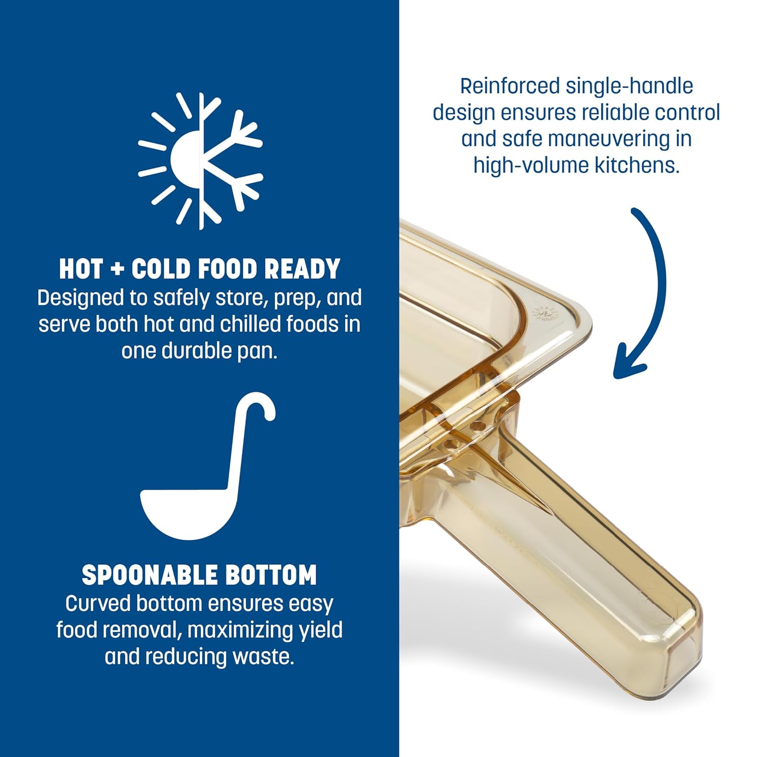 Designed with high heat applications in mind, StorPlus High Heat Food Pan with Handle can be used in food wells, holding ovens and microwaves. Built with a molded handle to reduce hand contact with food, the durable plastic pan offers a spoonable bottom to easily dish out food while preventing food waste. Pair the pan with a coordinating lid and drain grate (sold separately) to serve and store a variety of sides and entrees.