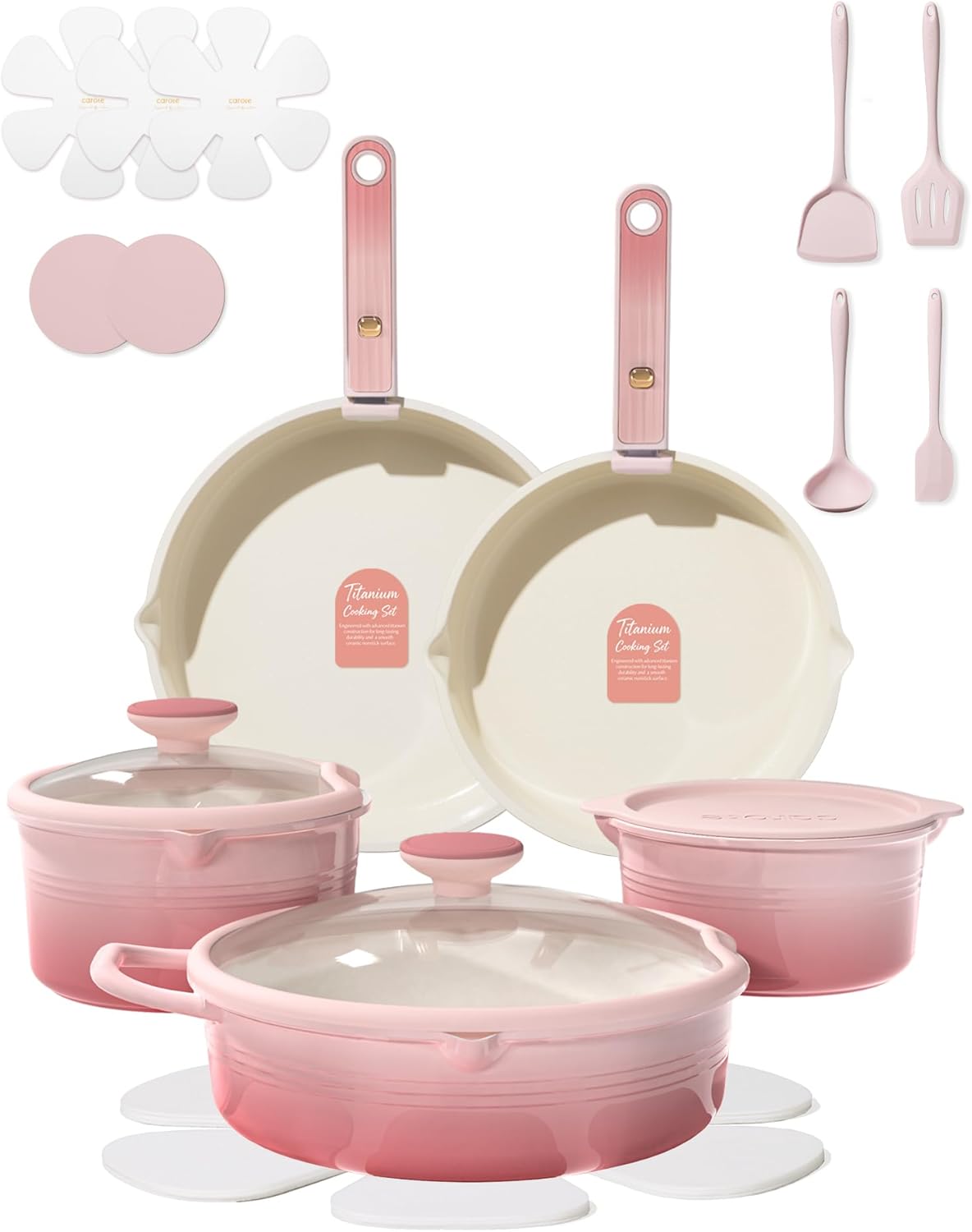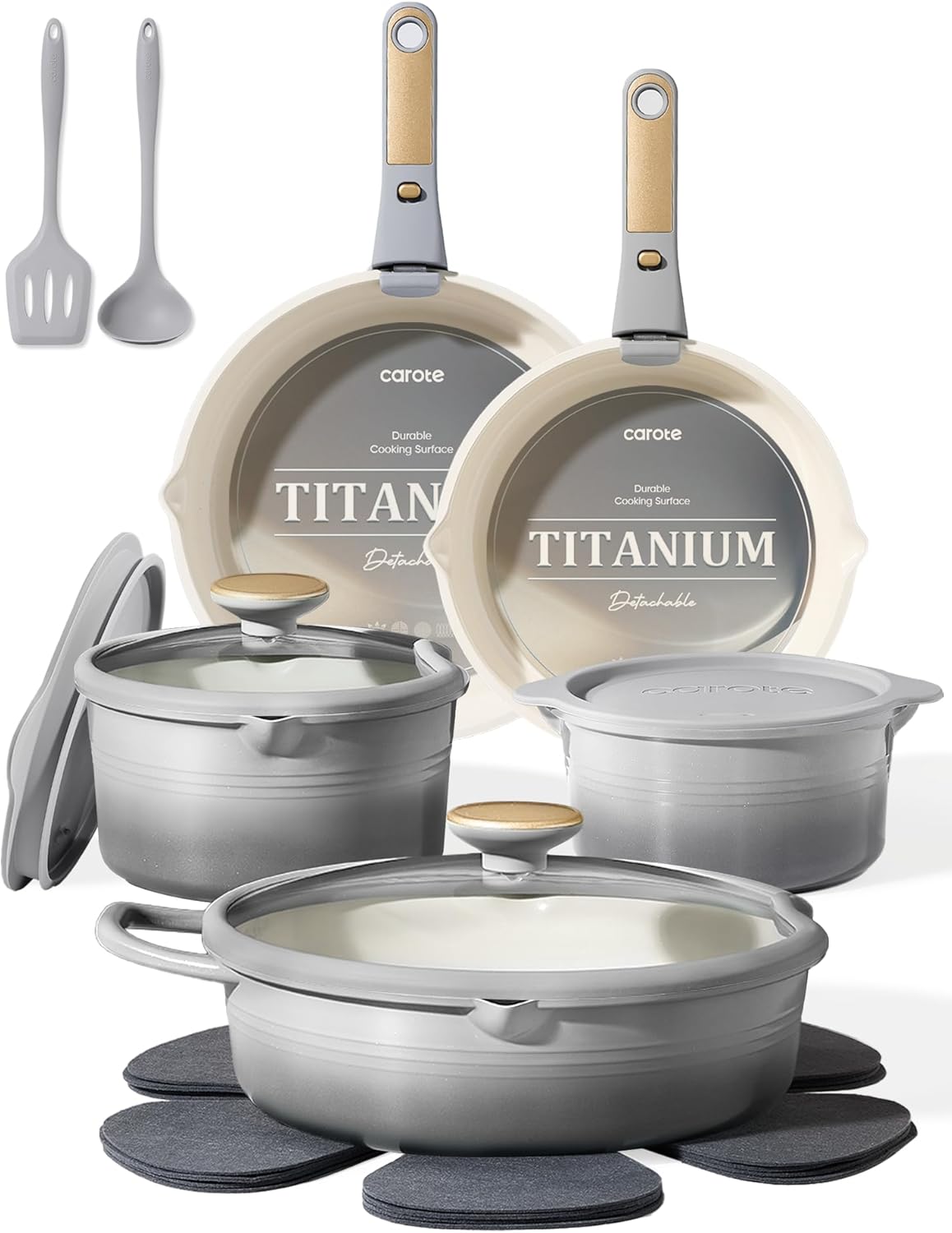 | Included Components | 2-qt saucepan, 3-qt saucepan, 9.5'' frying pan, 11'' frying pan, 5-qt saute pan, 2*detachable handle, 7''silicone cover, 8"/11"silicone lid, 4*utensil, 2*trivet, 4*pot protector |