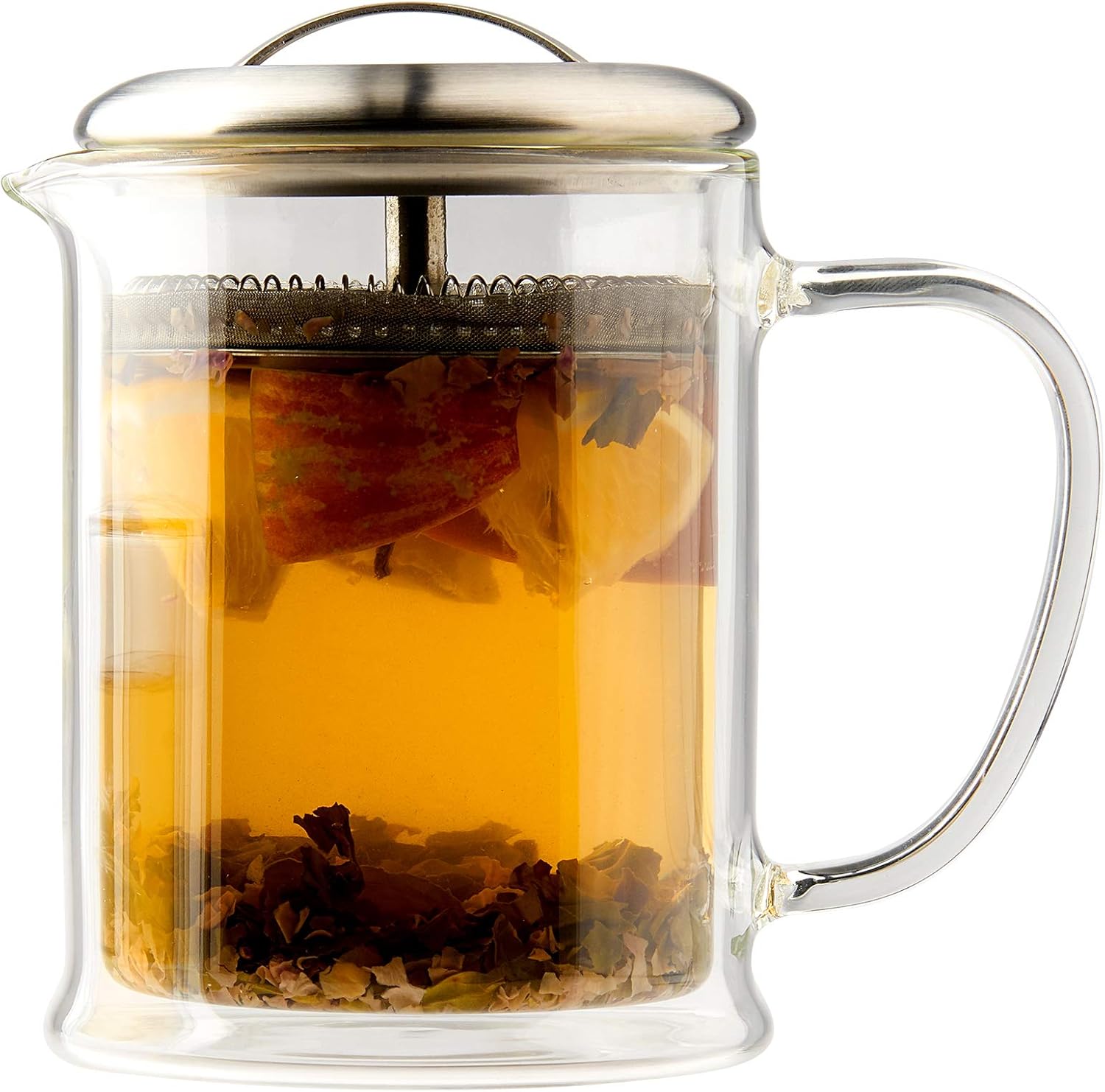 24 oz Double Wall Teapot with strainer lid. Made with double wall borosilicate glass. The double wall glass keeps the tea hotter longer and does not sweat or leave marks on the table. The teapot includes a stainless steel ultra-fine mesh strainer lid. The strainer will filter the tea leaves when pouring. The teapot has plenty of room for the tea leaves or tea bag to bloom or steep. To use add the desired amount of tea and pour in hot water. Place the lid back on the teapot, let it steep for the desired amount of brew time and then pour it out and enjoy a nice cup of tea Dishwasher safe. Do not use in the microwave. BPA Free. This is a great product for entertaining or personal use as the larger capacity allows more than one serving.