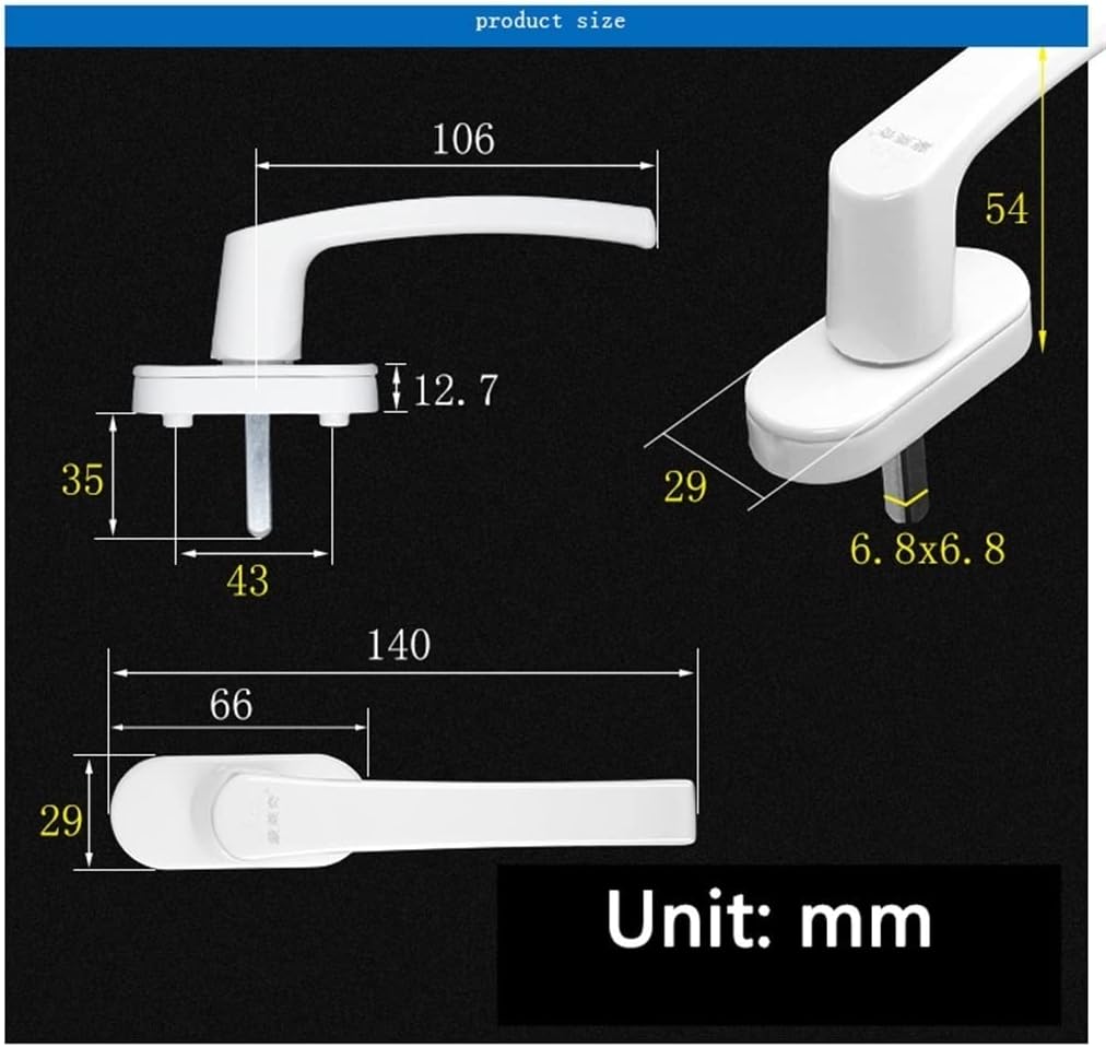 Product Name: Plastic steel internal drive handleMaterial: zinc alloyColor: WhitespecificationMain pole: 106mmHole spacing: 4mOverall length: 140mmWidth: 29 mmHeight: 54 mmNeed to meet the following 4 basic conditions1 There is plastic steel in the window, pay attention to the handle and the connecting rod2 mounting handle position width can accommodate 29mm wide handle base3 square shaft thickness 6.8 × 6.8mm, outer leakage shaft length 35mm4 installation fixed center hole spacing must be 4mIf you have problems with the installation, please contact us and we are committed to improving the customer's service.