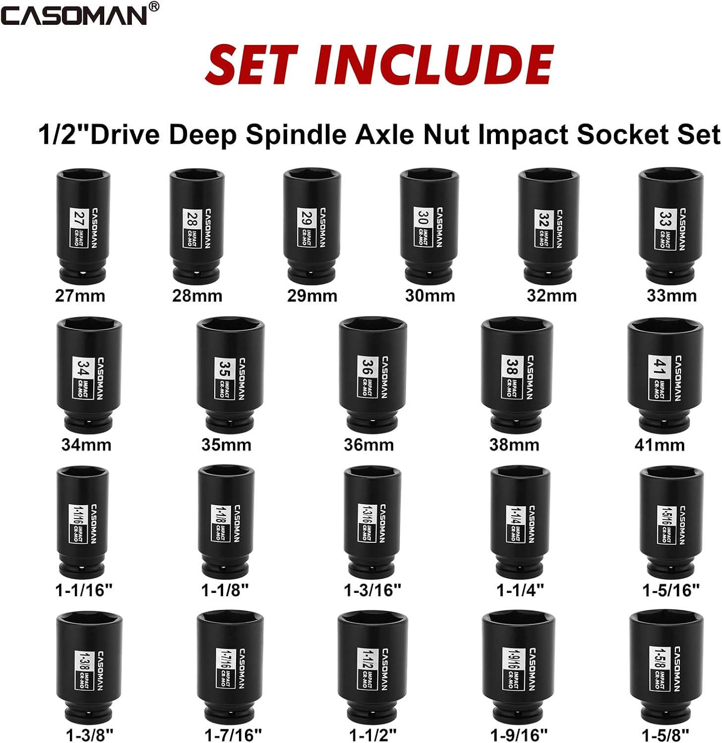 This CASOMAN 1/2" Drive Deep Spindle Axle Nut Impact Socket Set delivers impact-grade durability with its drop-forged and heat-treated Cr-Mo steel construction. Featuring a corrosion-resistant black phosphate finish, it offers long-lasting protection, while permanent laser-etched size marking remains clearly visible even in in dim or busy workspace. Its 6-point flank drive design maximizes grip on fastener flats, eliminating rounding during high-stress removal. Compatible with impact wrenches and drivers, this tool is your ultimate solution for bearing maintenance, truck repair, and heavy-duty extraction work.