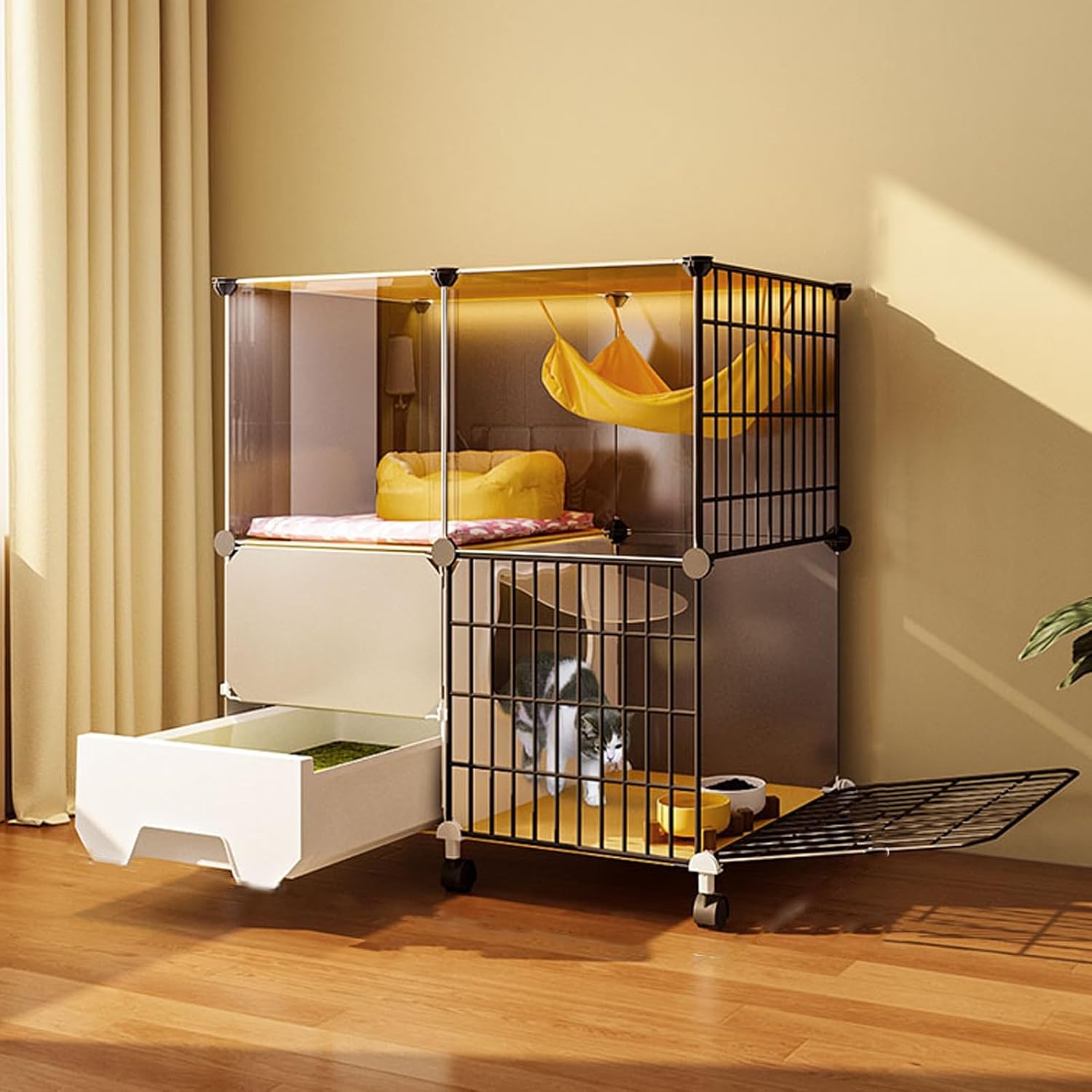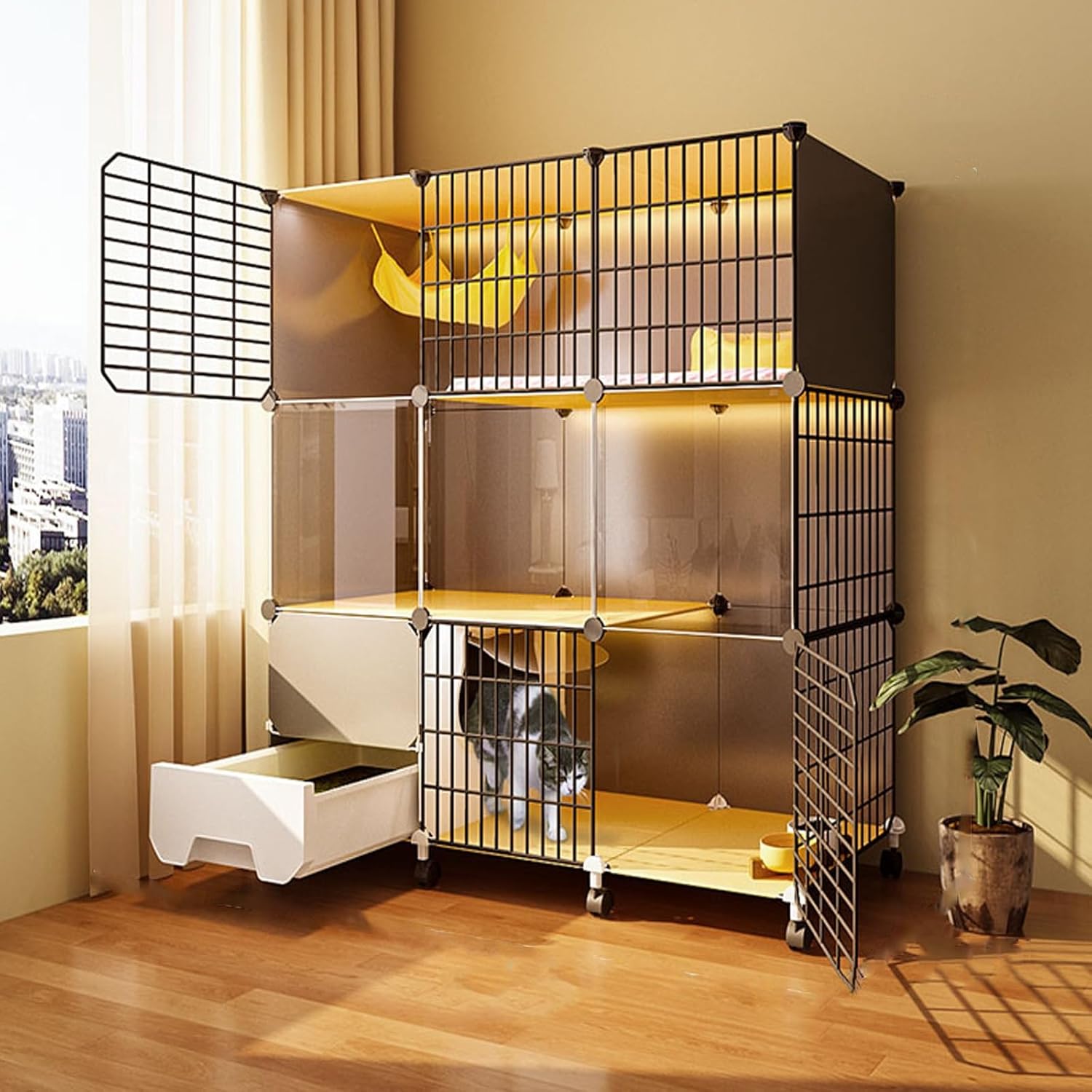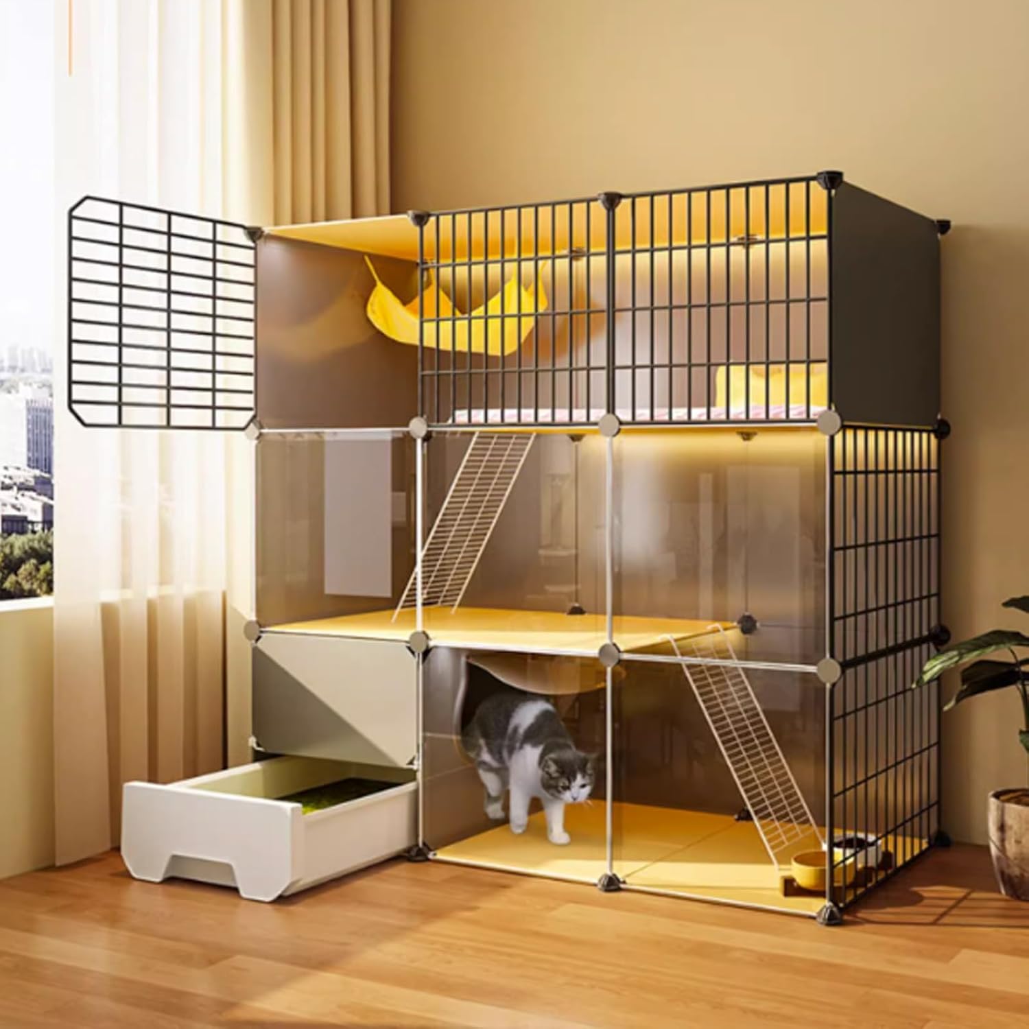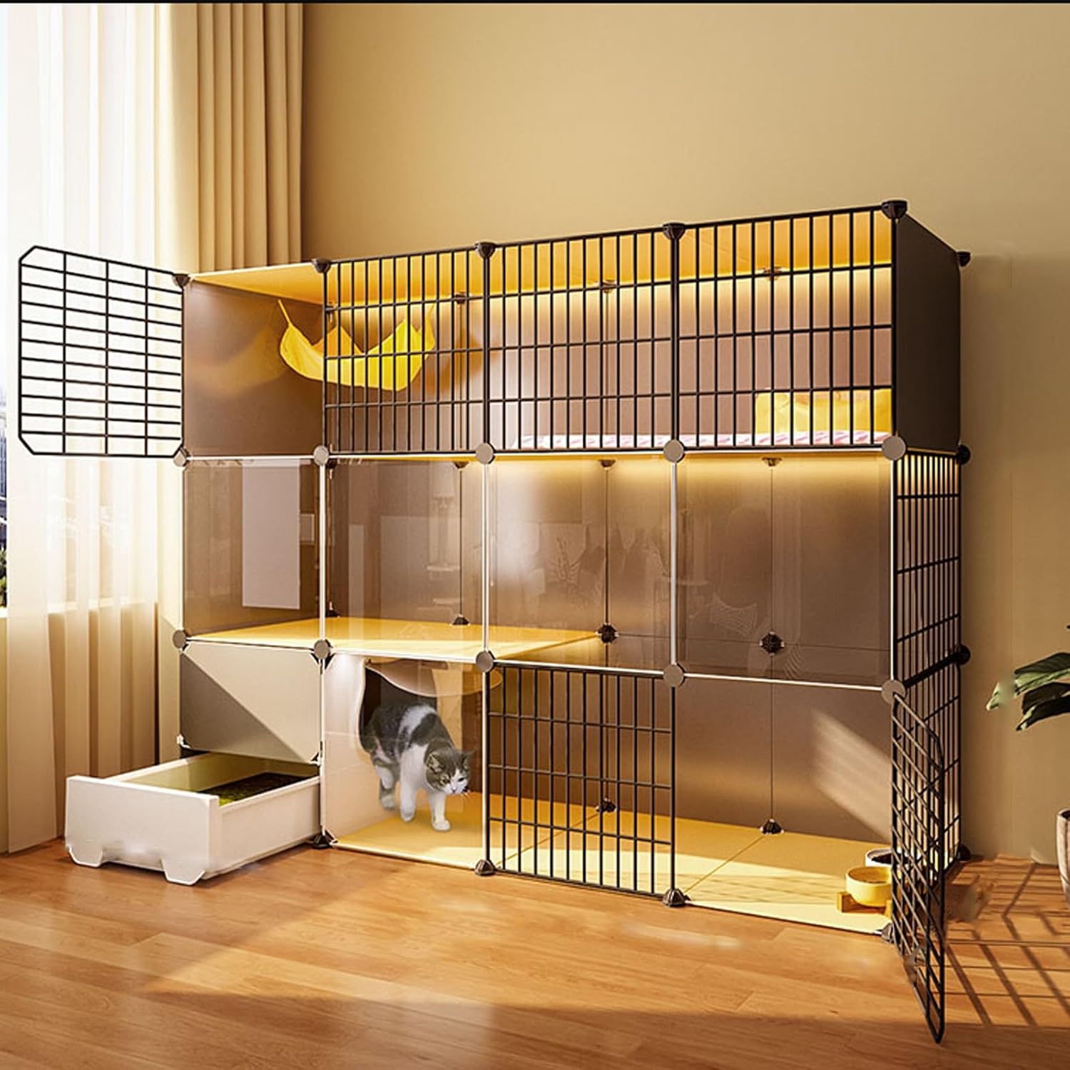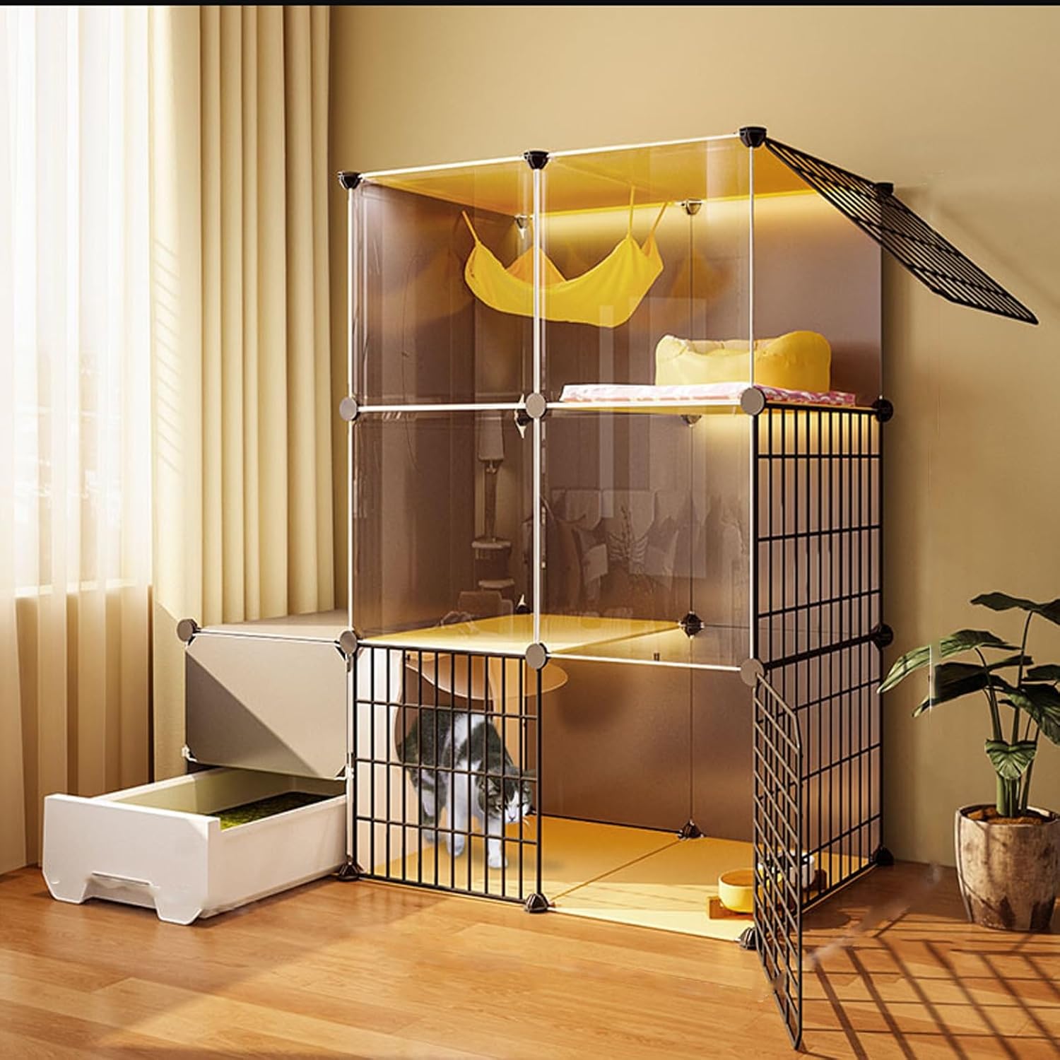 Specification: Name: DIY detachable cat cage / Cat kennels / Cat crate / Cat enclosure / Pet fence / Pet playpen / Cat house / Cat cage villa / Cat apartment cage / Cattery Material: Metal, ABS plastic, resin Size: (The size is as shown in the picture) 75*39*73CM , 75*39*78CM , 109*39*73CM , 75*39*107CM , 75*39*112CM , 109*39*107CM , 109*39*78CM , 109*39*107CM- (1) , 109*39*112CM , 75*49*73CM , 75*49*107CM , 109*49*107CM , 145*39*107CM Package: Package A: Enclosed litter box, litter scoop, installation tool Package B: Enclosed litter boxes, litter shovels, installation tools, cat nest, cat bowls, ladders Assembly Required: Yes Features: Transparent ---You can observe your pet from any angle and interact with it at any time. Pet's Own Rest Space or delivery room---You can create a space or delivery room that belongs to your pet, giving them more sense of security and safety. Pet Playtime ---When your pet is bored and lonely, you can put their favorite toys in the enclosure, they will have a fun place to play. Note: This product includes only one cage in the picture, other accessories in the cage are not included. If you need other accessories, you need to buy the package, there are 2 kinds of packages A, and B to choose from. Package List: Cat cage *1 Package A/B *1