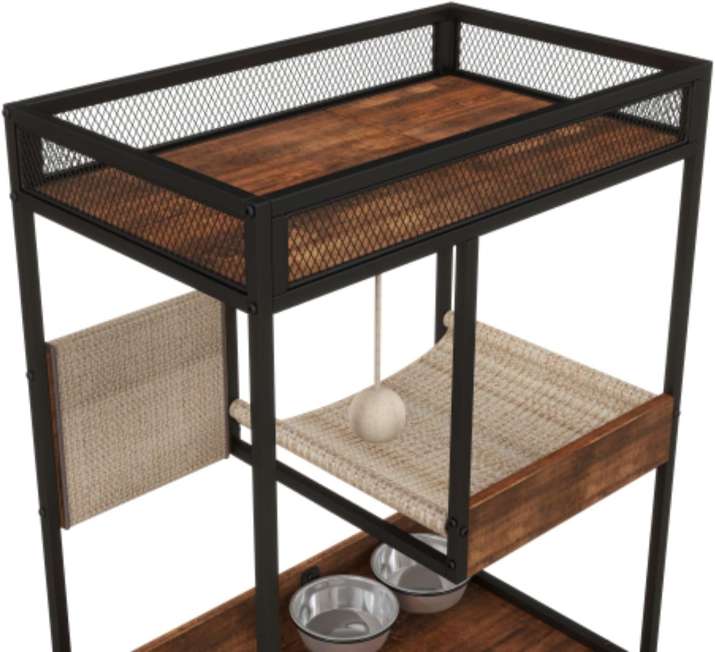 This pet furniture is made of P2 grade particle board and thickened metal frame to ensure the stability and durability of the structure. The design combines multiple functions such as cat house, feeding station, cat scratching mat and storage space, suitable for placement in multiple areas of the home. Its furniture-style design allows it to perfectly integrate into the home environment. It is not only a practical pet product, but also a beautiful interior decoration. Product Information Product Type: General Goods Product Name: Cat Litter Box Fence with Cat Tree Tower, Cat Furniture, Cat Cabinet Main Color: White + Retro Main Material: Particle Board Product Dimensions Assembled Length (inches): 23.62 Assembled Width (inches): 18.90 Assembled Height (inches): 48.40 Weight (pounds): 42.67