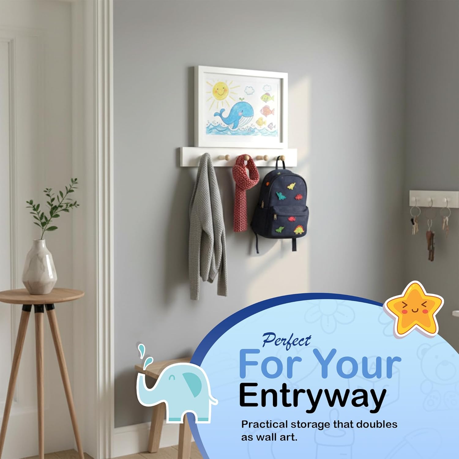 | Recommended Uses For Product | Displaying kids' artwork, Coat rack and key holder, Organizing entryways and playrooms, Dog leash holder |