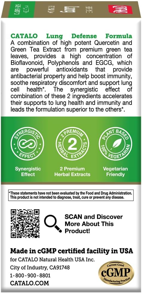 Lung Defense Formula (60 Capsules) combines Quercetin and Green Tea Extract to help protect lung cells from potential damage caused by harmful substances. This powerful blend, rich in bioflavonoids, polyphenols, and EGCG, offers antibacterial properties that work together to promote the well-being of the lungs. Ideal for those concerned about environmental factors like air pollution or looking to enhance respiratory function, this formula offers a convenient way to protect and strengthen the lungs with each dose.