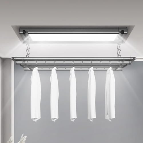 Ceiling Clothes Dryer Wall and Ceiling Clothes Dryer Aluminium,This retractable ceiling drying rack is easy to install. It does not require any complicated tools. It is safe and easy to use. The folding drying rack is chic in design, stylish in appearance and easy to utilize. Ultra Thin Invisible Electric Clothes Hanger Balcony Intelligent Drying Rack Home Remote Control Lifting Automatic Telescopic Clothes Hanger Name: Electric Clothes Hanger/Electrical Drying Rack Material: Aluminum alloy Color: Grey/White Rated voltage: 220V/50Hz Overall size: 115 * 55 * 11cm Installation hole spacing: 102.5 * 19cm Lifting height: 9.5-120cm Load bearing: 35kg Packaging included: 1 pc * Drying Rack(Including all installed accessories) Notice: 1. Please check the size before buying. Due to manual measurement, an error of 0-3mm will occur. beg for mercy! 2. Excluding items other than the drying rack in the product photos. 3. Please note that due to different monitors, there may be slight color difference, please understand. 4. The above data is for reference only, the size is manually measured, each variable may be different, please refer to the actual product, thank you.