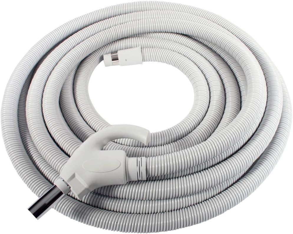 The 93620 is designed to provide superior airflow in a lightweight design to address the two features most desired in a central vacuum on/off control hose. The 360 degree swivel handle is designed to reduce kinking, stress on the hose, and stress on you as the user by relaxing any tension in the hose as you move through the room. The 35 foot length provides extra reach and insure there is sufficient length to prevent tugging and pulling to reach to the corner of the room. The pearl-gray color and soft rounded crown is designed to reduce the possibility of marking walls, floor, or furnishings while also avoiding wear to doorframes and chair legs. The hose is compatible with industry standard central vacuum inlets including Nutone branded valves equipped with low voltage contacts in the opening of the inlet valve. You can confirm suitability by putting your finger into the hose opening and confirming there are two low voltage contacts on the upper surface of the opening. No need for concern as these contacts are low volt and will not harm you in any fashion. The 93620 is compatible with all major brands of central vacuum including Eureka, Beam, Electrolux, Vacumaid, Canavac, Hoover, Cyclovac, Husky, Vacuflo inlets with pin jack inlets, M+S, MD, Imperium, and most regional brands.