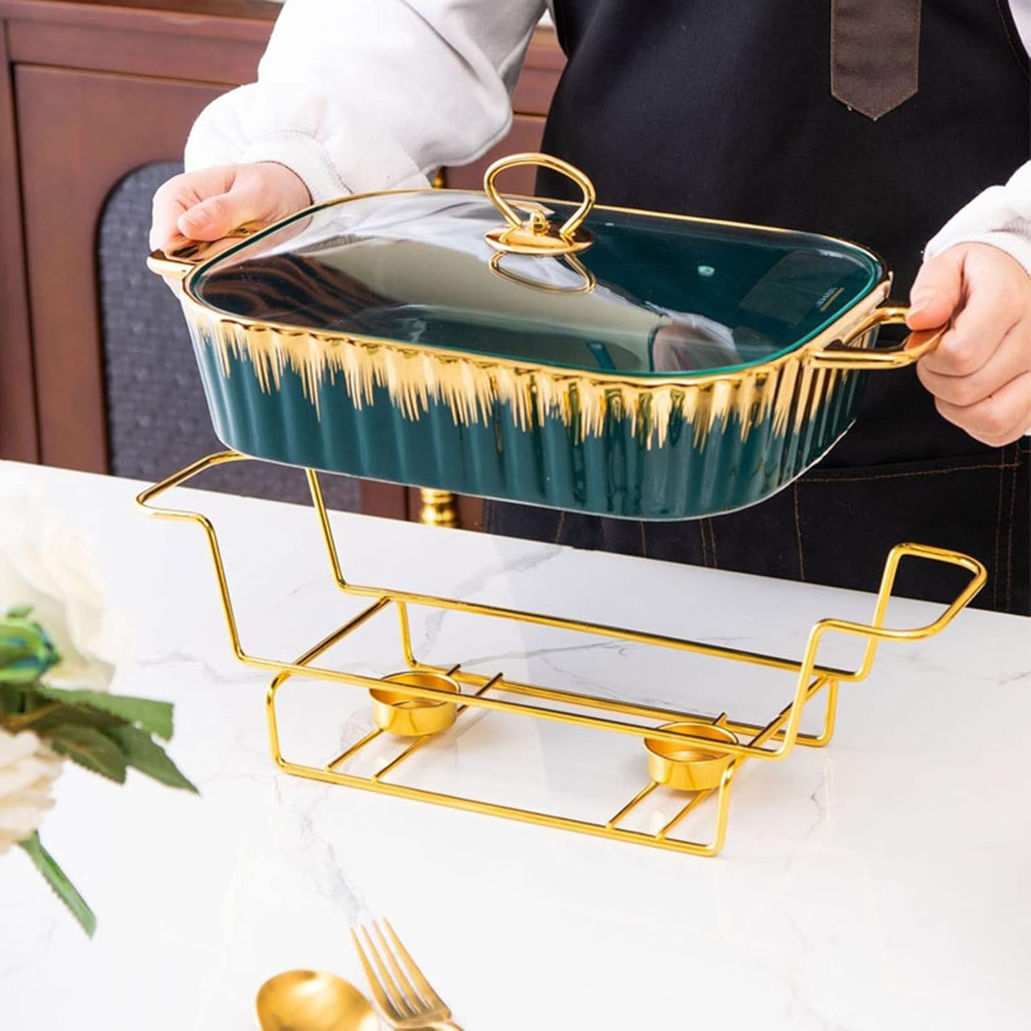 1.Are you worried about the need to prepare enough food when you party, while maintainingthe temperature of the food. This Buffet r Warming Food Tray is the perfect complement to keep these things warm. 2.Very suitable for any gathering, buffet, office, graduation ceremony, Thanksgiving, Christmas, large gatherings, hotel breakfast area, catering, parties, weddings, any catering activities. 3.It can be used indoors and outdoors without being restricted by the cateringplace. 4.An hot pot that can and reheat your food, ready to be d at banquet tables, buffet counters and other dining events.The two handles on both sides can easily move the . 5.High-quality ceramic pot, fired at high temperature, delicate to the touch, hard ground, with iron bracket, that sparkles in your venue's ambient. Sturdy legs and a firm grip on the lid handle ensure stability and safety. strong and durable, and long-lasting. Product size: 1.5L : L28×W20×H16.3CM 1.8L : L32×W22×H16.3CM 2.3L : L38×W23.5×H16.3CM Color: Black , Green , White; Product material: Ceramic pot+iron stand; We always do our best to provide our customers with the best . If you have any other s, please feel to , we will reply you within !