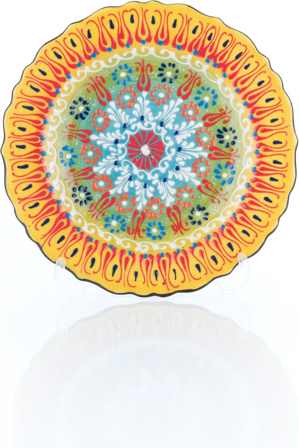 Bring vibrant artistry to your home with this Hand-Painted Ceramic Decorative Plate. Measuring 9 inches (22.8 cm), this lead-free ceramic piece features intricate patterns inspired by Turkish and Mexican designs. Perfect as a wall hanging (string included) or a tabletop centerpiece (stand included), it adds elegance to any space.Each plate is handcrafted and unique, showcasing artisan skill. Its vibrant colors and detailed design make it a stunning addition to kitchens, living rooms, or dining areas. Made from durable, dishwasher-safe, oven-safe, and microwave-safe ceramic, it’s as functional as it is beautiful.Ideal as a gift for housewarmings, weddings, or decor lovers, this decorative plate is both stylish and versatile. Use it as a piece of functional art or a statement accent for your home. Add timeless beauty and craftsmanship to your decor collection with this exquisite ceramic plate!
