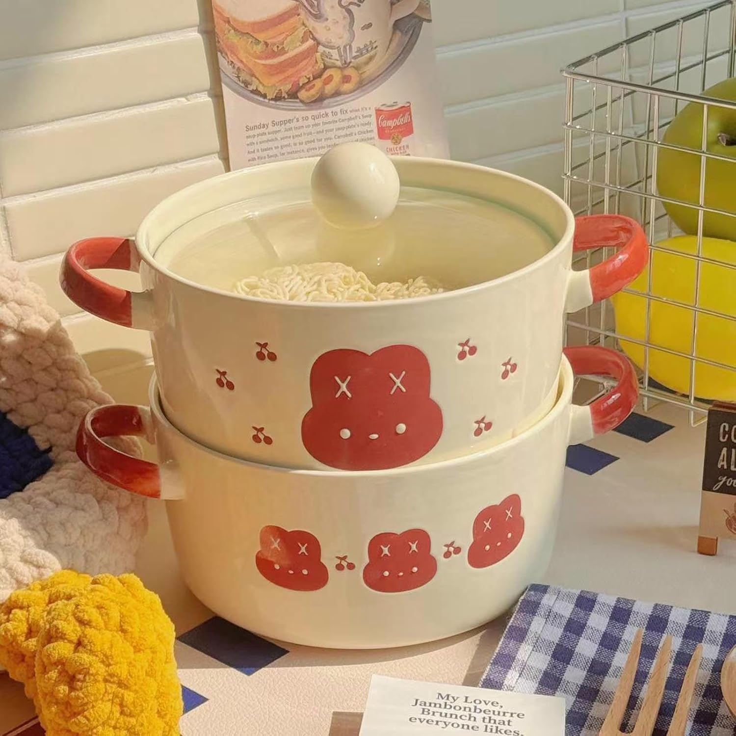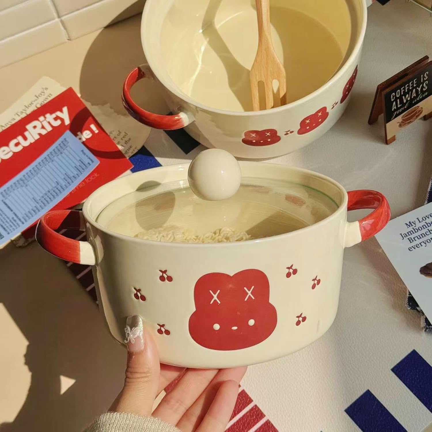 Product category: bowlmaterial: ceramicpattern: animalstyle: cute windshape: roundcolor: "Violent rabbit" with double ears bowl (without cover), "Violent rabbit" with double ears bowl (with cover)+.