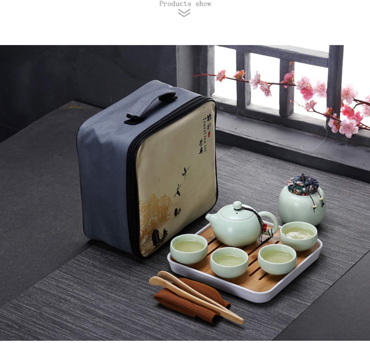 Product Features: Product Material:Made of high quality ceramics,beautiful and practical.Tea tray is made of bamboo panel and melamine chassis. Color: peak green Product size:Teapot:12*8cm; Teacup:6.2*2.9cm; Tea Tray:20*20*3cm; Tea Canister:9.5*8.3cm; Tea Towel:25*25cm; Tea Clip :18cm; Travel Bag :24*24*12cm Product Include:Teapot *1; Teacups *4; Tea Tray *1; Tea Canister*1;Tea Towel *1; Tea Clip *1; Travel Bag *1 What is tea set? Tea set include teapot, tea tray, teacup, tea caddy, etc.This tea set variety is much, fittings is all ready, all kinds of tea sets have different functions,a set solves all kinds of problems and greatly improves the quality of drinking tea.Make tea simple and special, have a kind of comfortable enjoyment. Teapot is a vessel with a mouth for making and pouring tea.The teapot is an integral part of the tea set. It is mainly used for making tea. Teacup is a utensil for holding tea.The requirement to the cup, best can accomplish "hold", "take" comfortable, "on the mouth" comfortable, "entrance" smooth. Tea tray used to hold a teacup or other tea set for holding water that has been spilled or dumped during the brewing process.Tea tray has plastic products, wood products, the shape of a circular, rectangular and other. Tea clip calls "tea chopstick" again, tea clip function and teaspoon are same, can carry tea dregs from kettle out.Also often somebody is carrying it to wash cup cup, prevent very hot sanitation. Tea towel is called tea cloth again, the main function of tea towel is to wipe teapot, the miscellaneous water that leaves at teapot or tea sea bottom holds before drinking tea is wiped dry, yi ke is wiped the tea that drops desktop. Tea canister is used to store tea leaves,must do not have miscellaneous flavour, can seal and do not pass light, its material has a lot of kinds, among them pottery and porcelain is the commonest.
