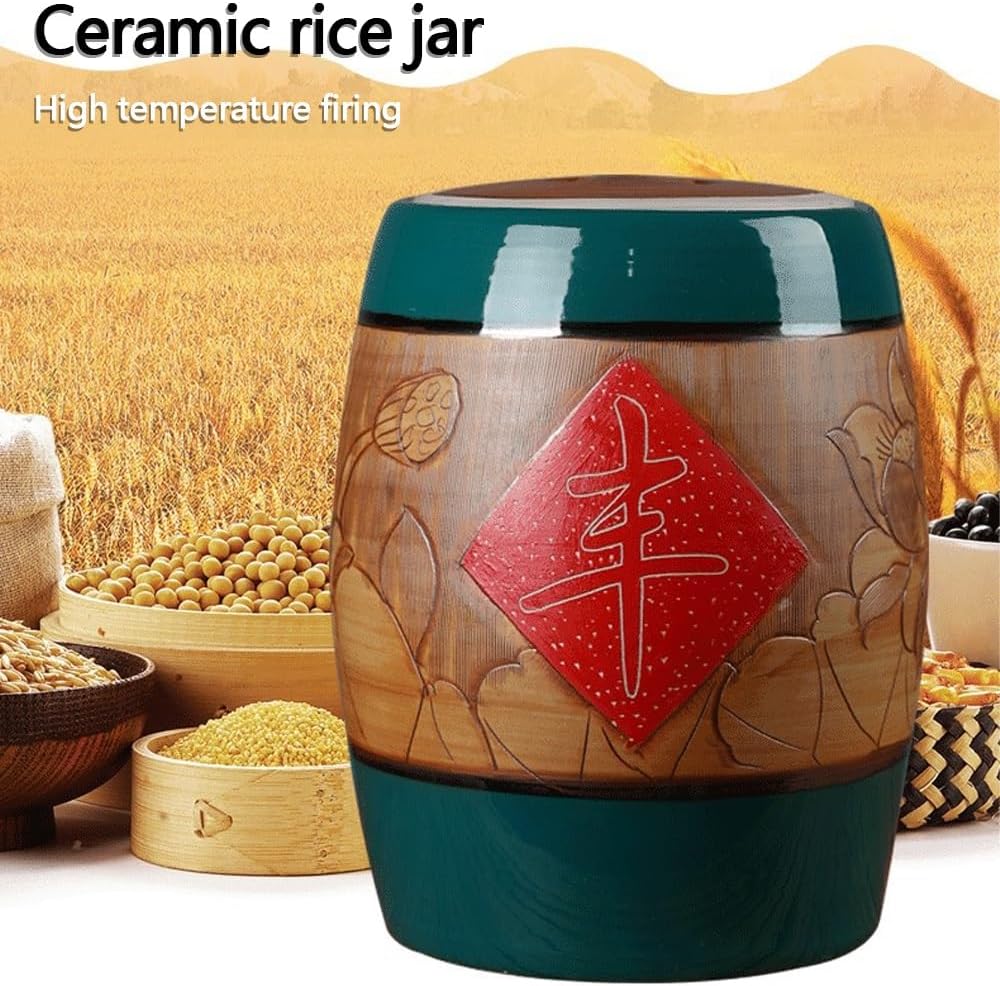 Traditional Chinese DesignThis exquisite ceramic rice jar features a captivating design, embellished with auspicious words and intricate patterns that celebrate the richness of traditional Chinese culture. It serves as a heartfelt gift for birthdays, holidays, or special occasions, making it perfect for partners, family, friends, or loved ones.Sealed Rice Bucket The tightly fitting lid ensures an effective seal, keeping your food fresh and flavorful. The large mouth design allows for easy access with measuring cups or spoons, providing convenience when serving. The raised edge design prevents rice grains from spilling out, helping to maintain a tidy kitchen.Exquisite WorkmanshipEmbodying a retro style, this ceramic rice bucket is both functional and a charming addition to your kitchen decor. The smooth barrel mouth is gentle on your hands, while the flat bottom offers stability, protecting your floors and countertops. The thoughtfully designed lid makes for easy handling and quick access.Large Capacity Grain ContainerAvailable in capacities of 10KG/22lbs and 25KG/33lbs, this versatile food storage jar can store a variety of items such as rice, candies, tea, nuts, and more. It effectively meets the diverse storage needs of your household, simplifying cooking and organization.Easy to Clean, Low MaintenanceWith its smooth surface and durable ceramic texture, this rice storage container is incredibly easy to clean. A simple wipe with a damp cloth removes dirt or oil, allowing you to maintain a pristine surface with minimal effort.Packing List:Ceramic rice storage jar * 1