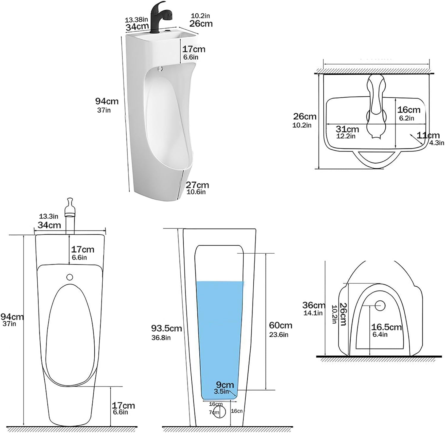 Upgrade Your Restroom with the Ultimate Space-Saving SolutionOur Modern Integrated Urinal with Wash Basin combines functionality with a sleek, minimalist aesthetic. Designed for both residential and commercial use, this fixture solves the common problems of water waste and limited space by merging a hand-wash sink with a powerful flushing urinal.Specifications:Material: Ceramic Installation: Floor-Standing (Height: 94cm) or Wall-Mounted (Height: 74cm)Features: Integrated Sink, Odor-Sealing Ceramic Plug, Self-Cleaning GlazeApplication: Home, Office, Hotel, Apartment, Commercial RestroomsHow does the integrated sink save water?The water used for handwashing flows directly into the urinal to perform the initial rinse, effectively reusing water that would otherwise go straight down the drain.Does it effectively block odors?Yes! Unlike many plastic or open-drain urinals, our model includes a specialized ceramic odor-shield plug that acts as a barrier against sewer gases and prevents clogging.Is the surface easy to clean?Absolutely. The 1270°C high-temperature fired glaze is non-porous and ultra-smooth, preventing residue buildup and stains from sticking.
