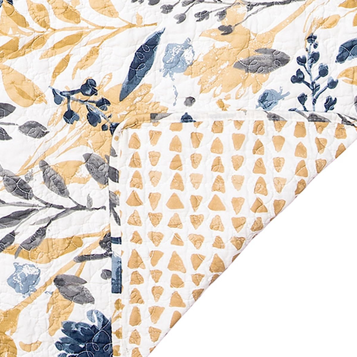 Transform your space with the rich color and dynamic design of Natural Home collection. elaborate leafy sprigs with delicate buds and subtly blooming flowers paint a lively yellow, blue, and indigo scene on a fresh white ground. Finished with an intricate floral medallion stitching design and reversible to an abstract, dotted geometric design in yellow for more bold styling options. Crafted of cotton and machine washable for easy care. Love this pattern? Natural Home is also available in our bedding and tabletop collections, and a ruffled valance.
